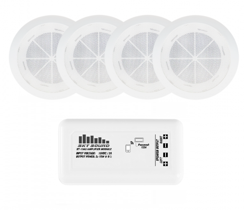 Акустичний комплект SKY SOUND BT-2504 складається з 4-х стельових динаміків SKY SOUND TS-2510W та одного підсилювача потужності SKY SOUND BT-1502 . Комплект системи озвучування призначений для невеликих приміщень, кафе, салонів краси чи офісів тощо. (До 50 кв.м.).