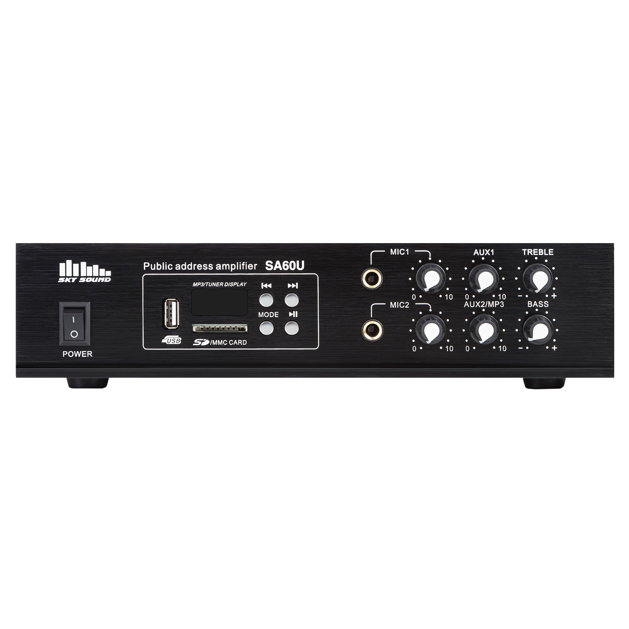 Трансляційний підсилювач Sky Sound SA-60U BLACK потужністю 60 Вт, призначений для створення невеликих систем трансляції та озвучування з сумарною потужністю акустики не більше 60-ти Ватт. Це можуть бути невеликі торгові підприємства, кафе та ресторани, офіси, АЗС спортивні майданчики та інше.