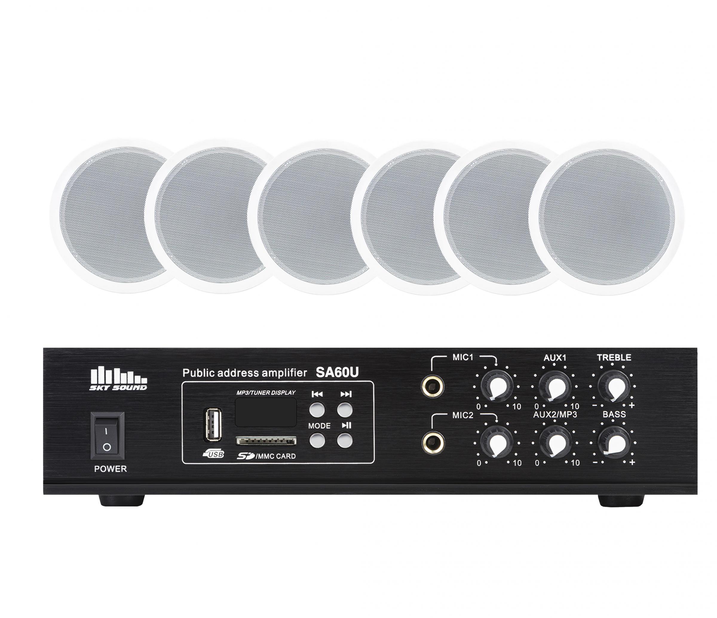Акустичний комплект SKY SOUND CSB-3106 складається з 6-ти стельових динаміків Sky Sound S-2631 та одного підсилювача потужності Sky Sound SA-60U BLACK. Комплект звукового обладнання призначений для озвучування невеликих приміщень, кафе, салонів краси чи офісів тощо. (До 60 кв.м.).