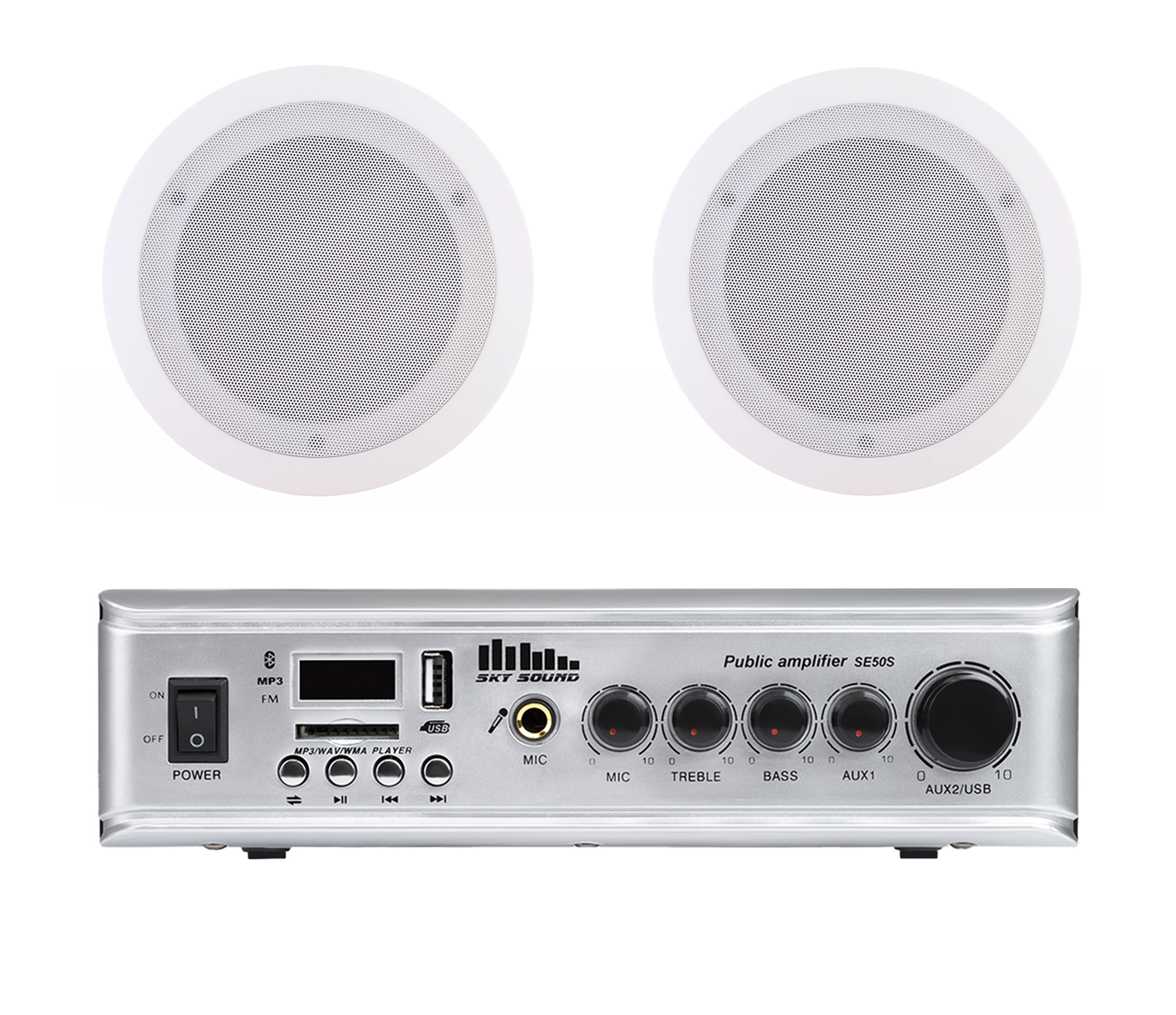 Акустичний комплект SKY SOUND CSE-7012 складається з 2-х стельових динаміків SKY SOUND CSL-701W/TW та одного підсилювача потужності SKY SOUND SE-50S . Комплект системи озвучування призначений для невеликих приміщень, кафе, салонів краси чи офісів тощо. (До 70 кв.м.).