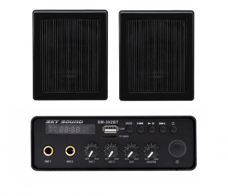 SKY SOUND SM-302BT (2*30W) - двоканальний підсилювач потужності для підключення до низкоомним акустичним системам трансляції фонового озвучування та мовного оповіщення.