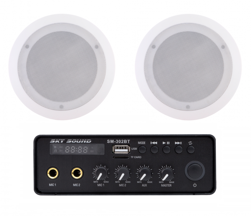 Акустичний комплект SKY SOUND SMС-3001 складається з одного компактного підсилювача потужності Sky Sound SM-302BT і 2-х стельових динаміків Sky Sound CSL-701W/TW. Комплект системи озвучування призначений для невеликих приміщень, кафе, салонів краси або офісів і т.д. (До 50 кв.м.).