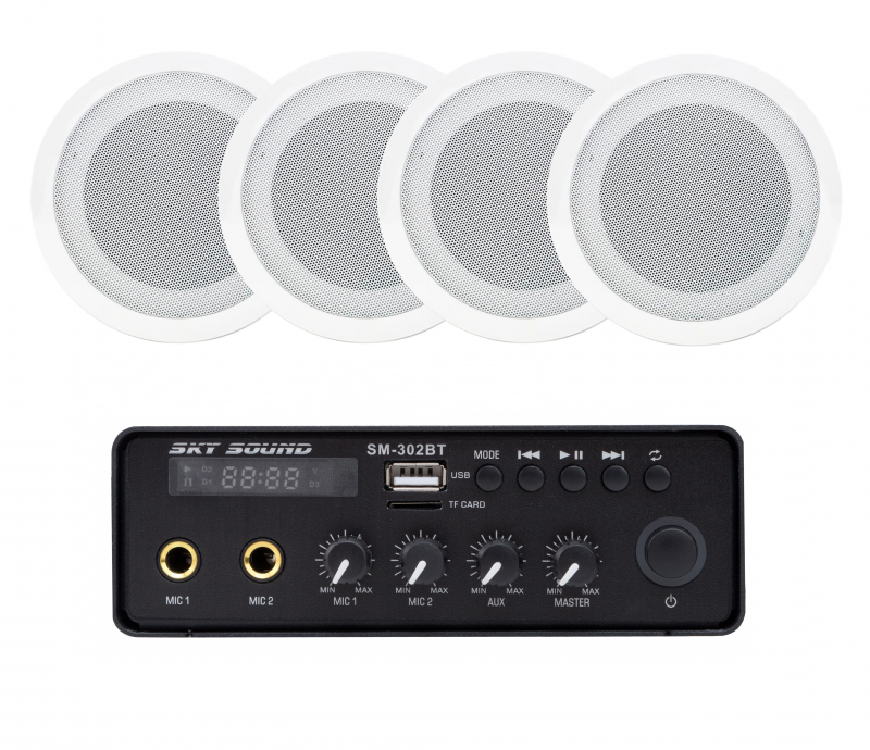 Акустичний комплект SKY SOUND SMS-SMS-3024 складається з одного компактного підсилювача потужності Sky Sound SM-302 і 4-х стельових динаміків Sky Sound S-2630W. Комплект системи озвучування призначений для невеликих приміщень, кафе, салонів краси або офісів і т.д. (до 50 кв.м.).