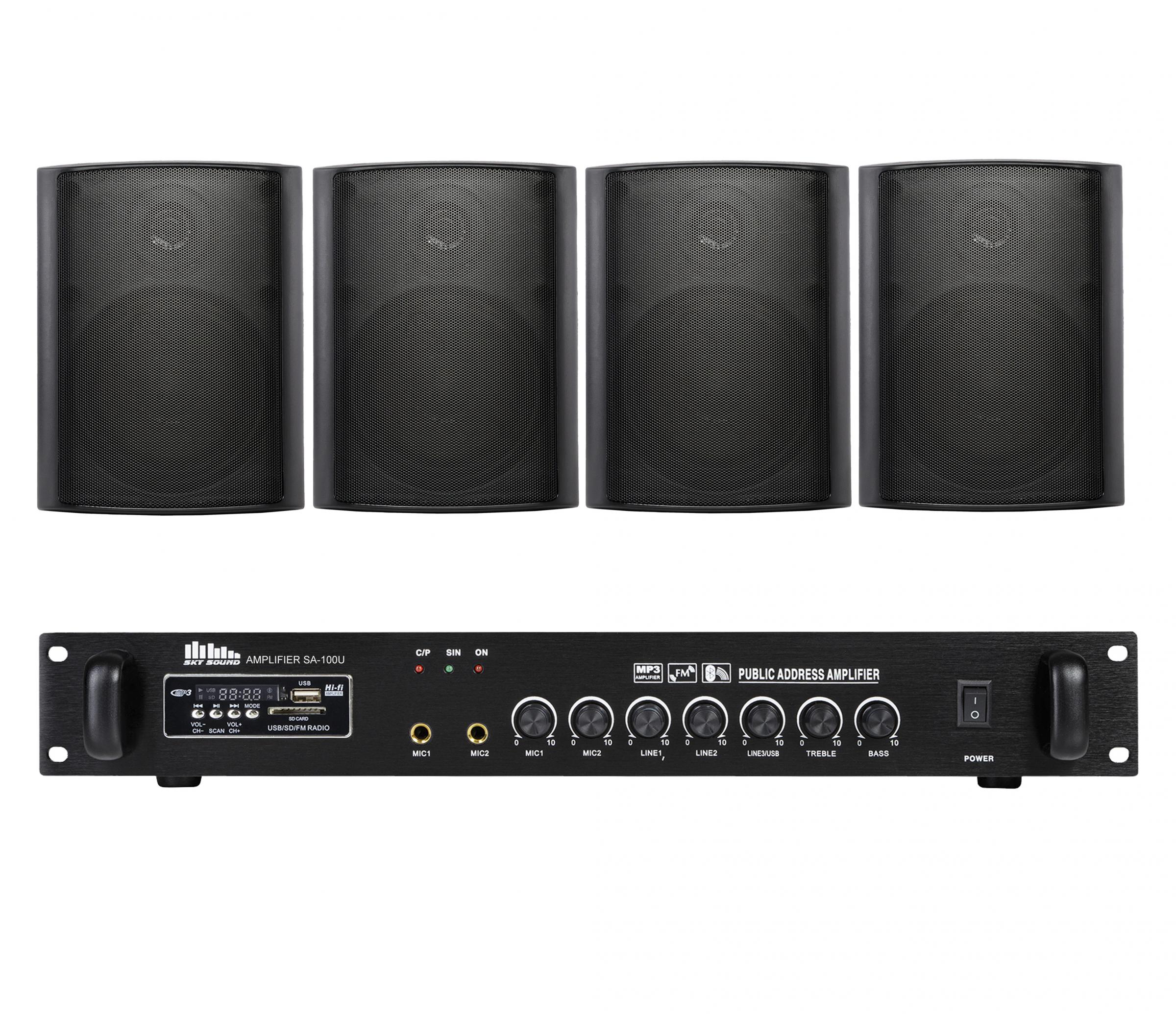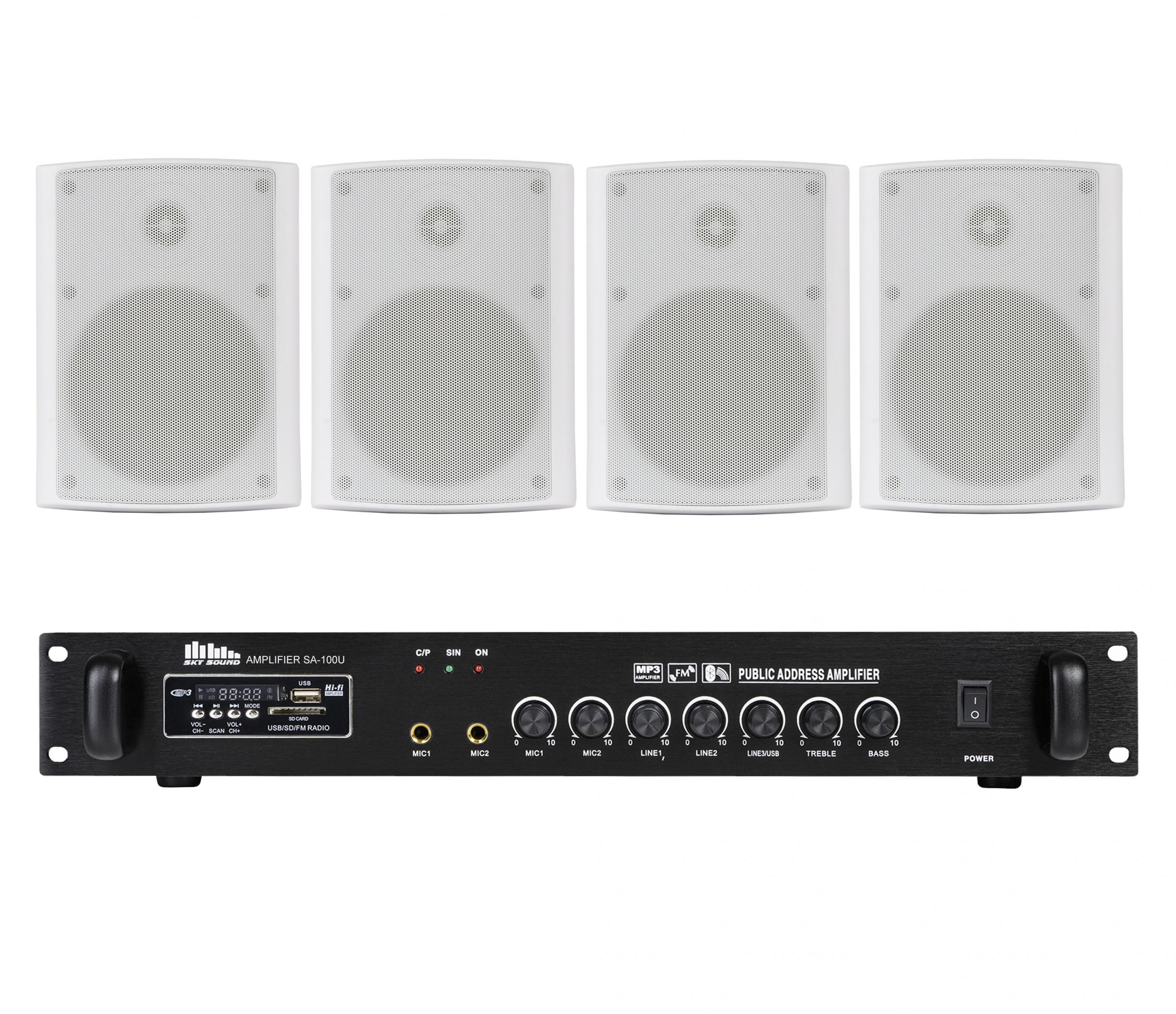 Акустичний комплект SKY SOUND WS-1034 складається з 4-х настінних колонок Sky Sound NS-30 (чорний / білий) і одного підсилювача потужності SKY SOUND SA-100U. Комплект звукового обладнання призначений для озвучування невеликих приміщень, кафе, салонів краси або офісів і т.д. (до 60 кв.м.).