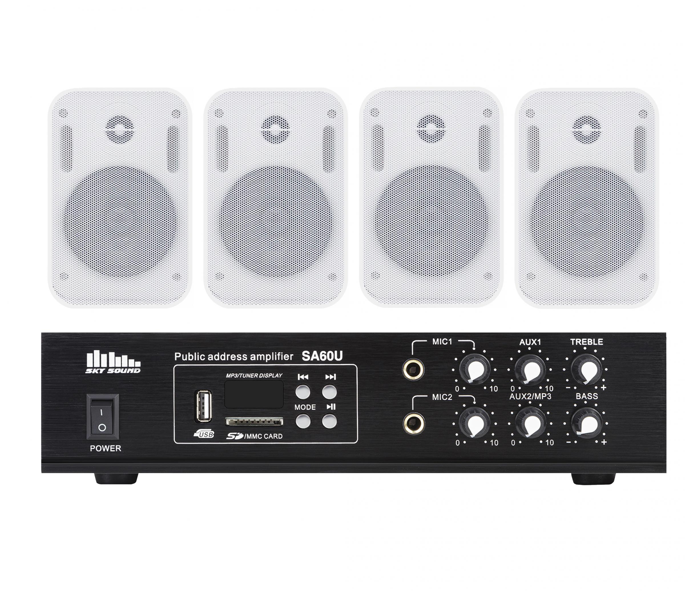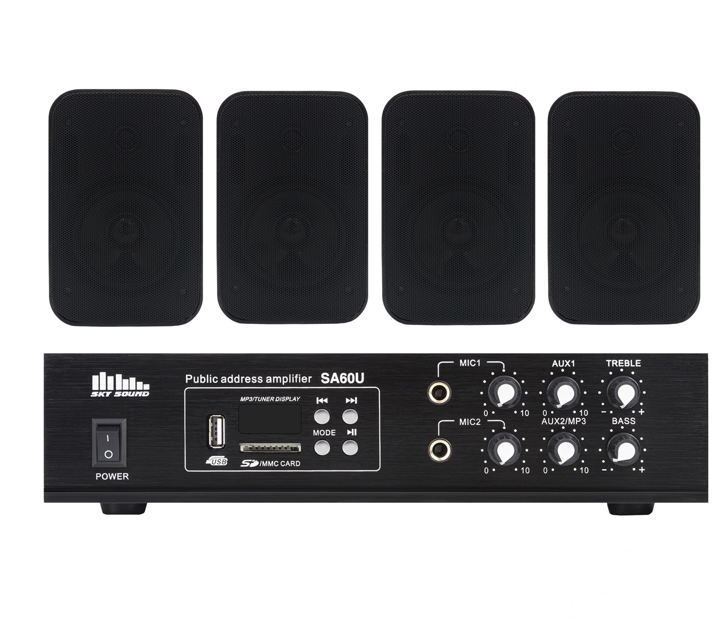 Акустичний комплект Sky Sound WSB-2404 складається з 4-х настінних акустичних систем Sky Sound PM-2401 та одного підсилювача потужності Sky Sound SA-60U BLACK. Комплект системи озвучування призначений для невеликих приміщень, кафе, салонів краси чи офісів тощо. (До 50 кв.м.).