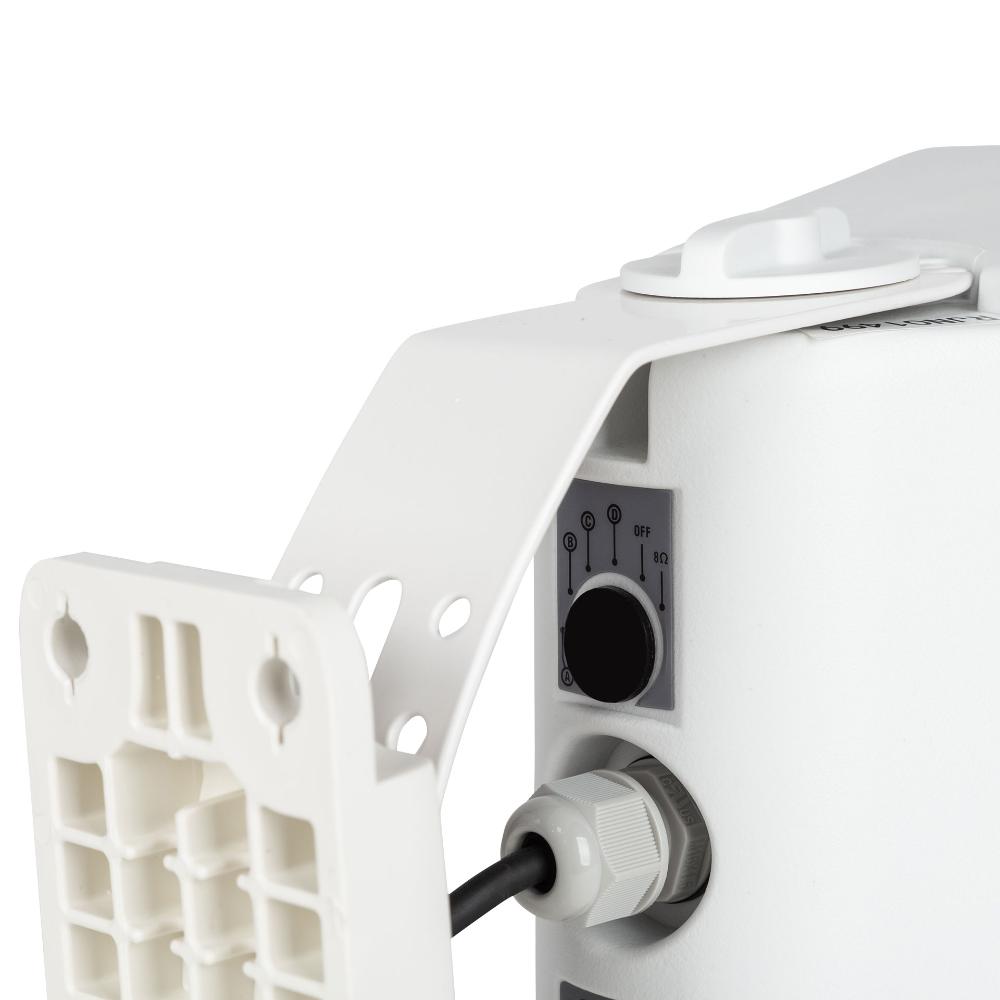 - Гнучкість підключення: Підтримує низькоомне підключення (8 Ом, 60 Вт RMS) та трансляційні системи 70/100 В з відведенням потужності 30 Вт, 20 Вт, 10 Вт або 5 Вт, що вибираються через поворотний перемикач під герметичною кришкою.
