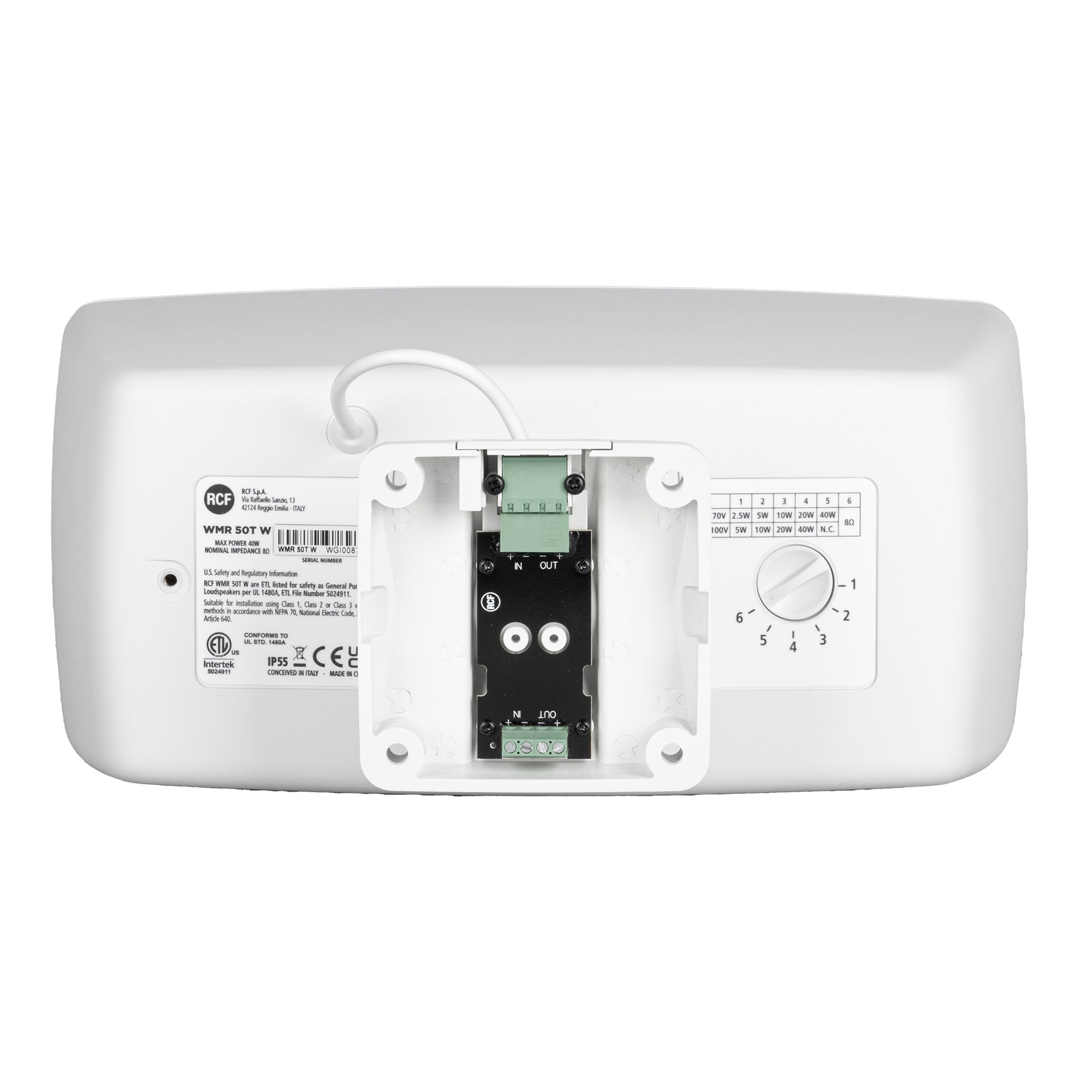 RCF WMR 50T W – це двосмугова акустична система з трансформатором, призначена для фонового озвучування та систем оповіщення в комерційних приміщеннях, таких як ресторани, бари, готелі, торгові центри та офіси. Модель поєднує компактний елегантний дизайн у білому кольорі (RAL 9010) із високоякісними компонентами, забезпечуючи чисте звучання та високу надійність.