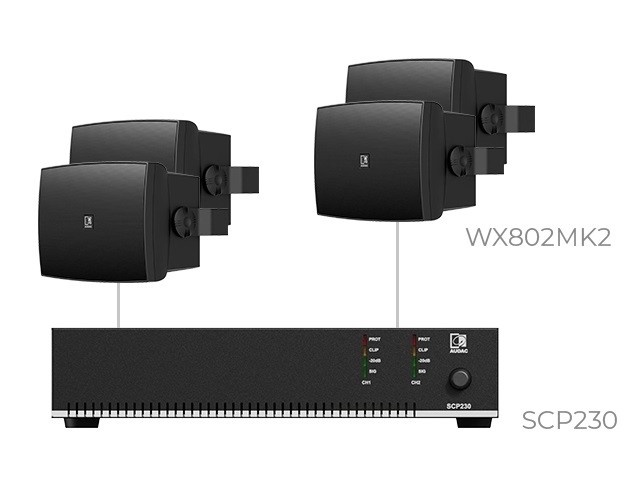 - 4 x Audac WX802MK2/O: Всепогодна акустична система