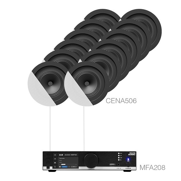 Акустичний комплект Audac CENTO5.12 — це готове рішення для високоякісного фонового озвучування та голосових оголошень у приміщеннях площею до 100 м². Комплект складається з дванадцяти двосмугових стельових гучномовців Audac CENA506 та одного компактного, багатофункціонального підсилювача потужності Audac MFA208. Ця система ідеально підходить для встановлення в кафе, ресторанах, магазинах, офісах, навчальних залах та готельних номерах, де потрібен надійний, ефективний та естетичний звук.