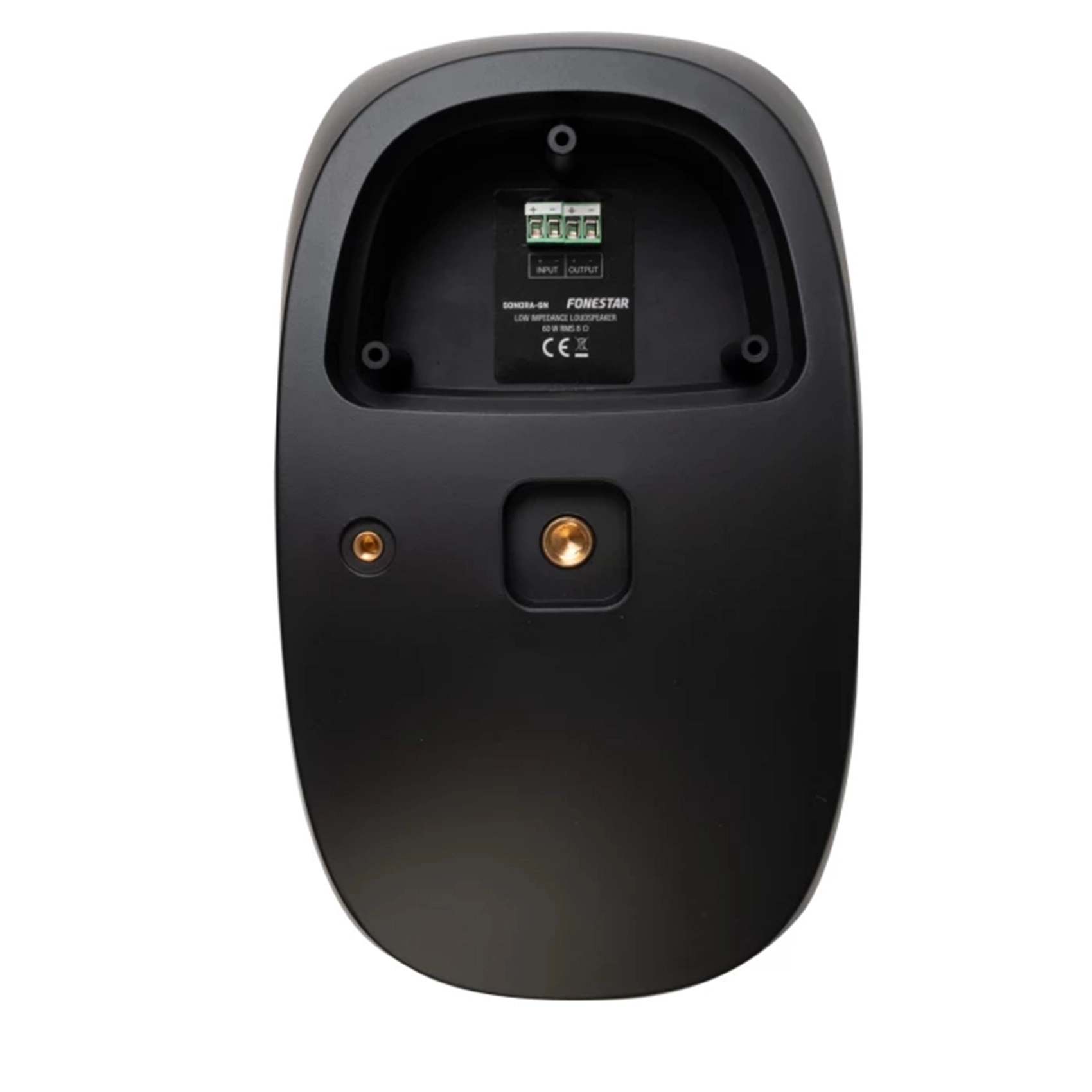 Fonestar SONORA-6N – це двосмугова пасивна акустична система із серії SONORA, розроблена для фонового озвучування та систем оповіщення у громадських та приватних просторах, таких як ресторани, кафе, супермаркети, торгові центри та тераси. Гучномовець оснащений 6-дюймовим (152 мм) поліпропіленовим низькочастотним динаміком і 1-дюймовим (25.4 мм) твітером, що забезпечують чистий звук без спотворень у частотному діапазоні 75 Гц. 20 кГц. SONORA-6N працює в низькоомному режимі (8 Ом) з номінальною потужністю 60 Вт RMS та максимальною 100 Вт. Корпус з ABS-пластику із захистом IP66 та алюмінієві грати гарантують стійкість до води, пилу, ультрафіолетового випромінювання та соляного туману (IEC 60068-2-11), що робить систему придатною для зовнішнього використання, включаючи морські та прибережні зони. В комплект входить регульований кронштейн (60° у всіх напрямках), гвинти з нержавіючої сталі та страхувальний сталевий трос для швидкої та безпечної установки. Підключення здійснюється через роз'єми Euroblock (вхід і вихід) для кабелю перетином 0.25 – 2.5 мм. SONORA-6N доступна у чорному кольорі (RAL 9005).