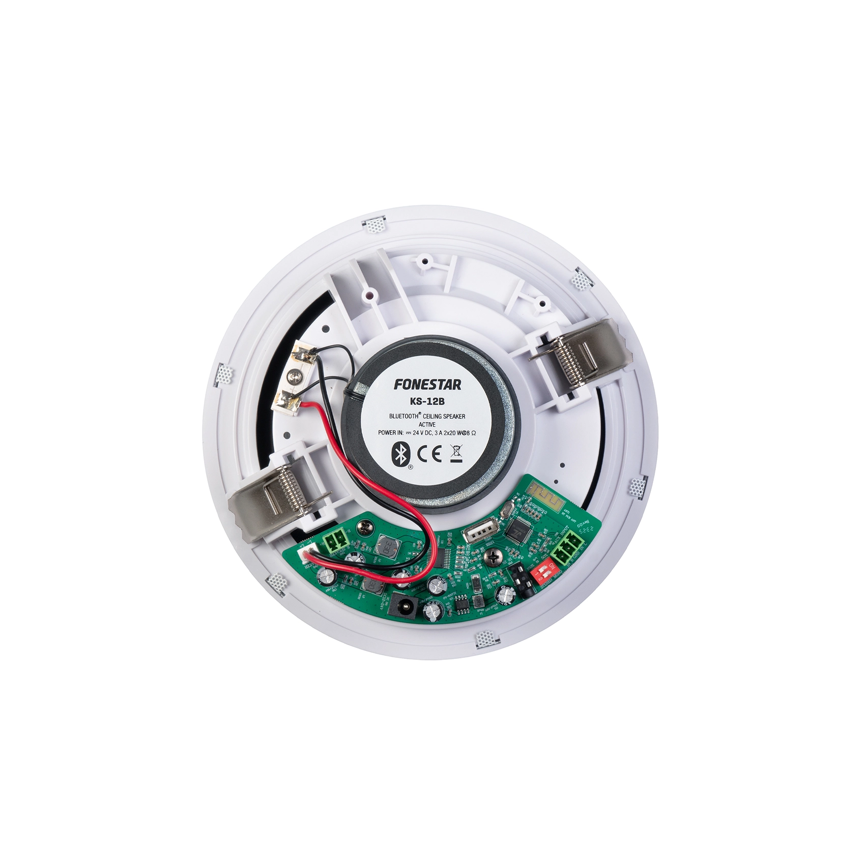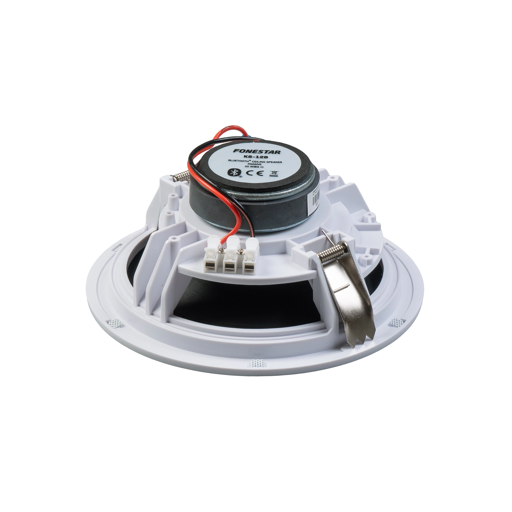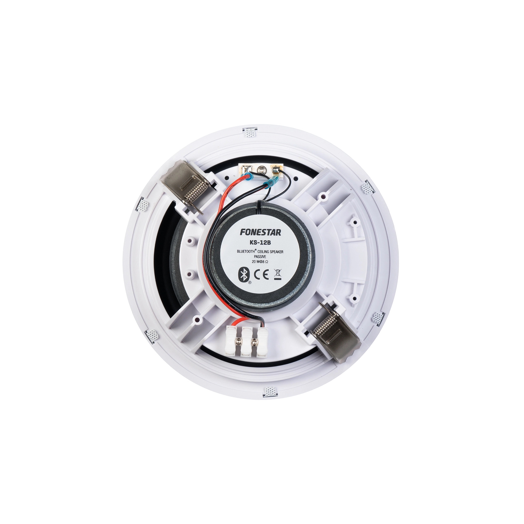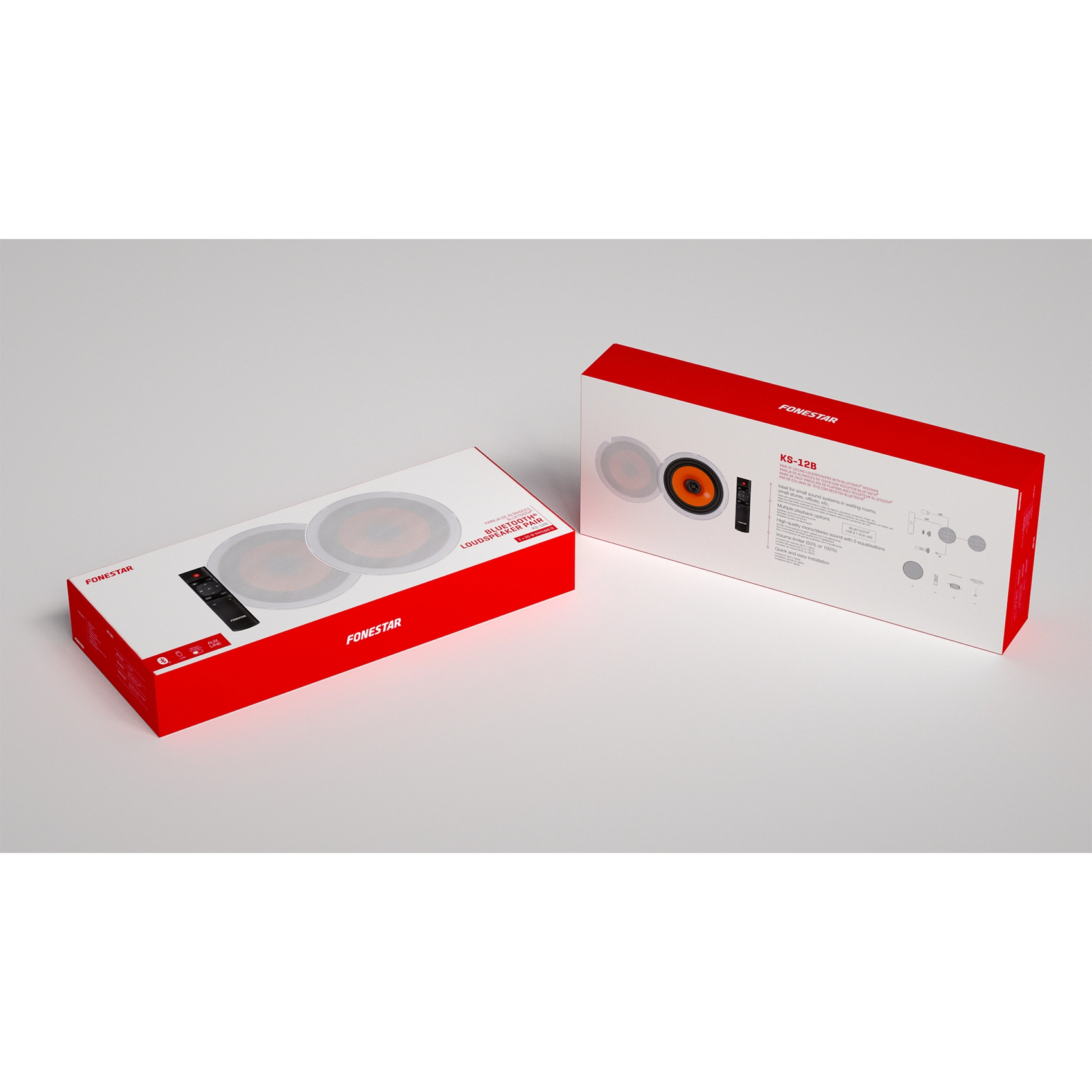 Fonestar KS-12B – це пара вбудованих стельових акустичних систем з Bluetooth, що складається з активної та пасивної колонок, призначених для високоякісного відтворення звуку в приміщеннях середнього розміру, таких як офіси, зали очікування, невеликі магазини, ресторани, кафе та приватні будинки. Модель поєднує потужний стереозвук, простоту встановлення та елегантний дизайн, забезпечуючи легку інтеграцію в будь-який інтер'єр завдяки безрамковою алюмінієвою решіткою.