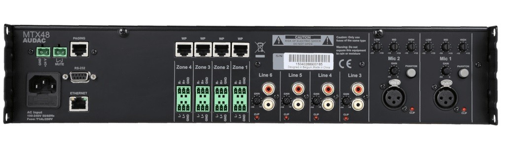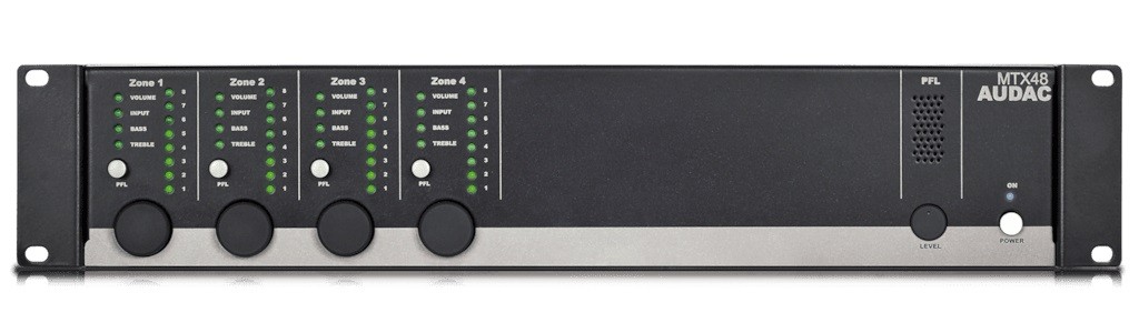 Audac MTX48 – професійний 4-зонний матричний підсилювач серії MTX, призначений для багатозонних аудіоінсталяцій у торгових центрах, школах, кафе, барах та інших комерційних об'єктах. Забезпечує гнучке управління аудіосигналом, інтеграцію із системами автоматизації та підтримку сучасних інтерфейсів управління. Компактний 2U рековий корпус, інтуїтивне керування та багаті комутаційні можливості роблять його універсальним рішенням для систем озвучування та оповіщення.