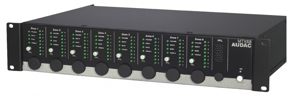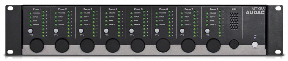 Audac MTX88 – професійний 8-зонний матричний аудіокоммутатор (передсилювач) серії MTX, розроблений для стаціонарних інсталяцій у великих об'єктах, таких як торгові центри, освітні заклади, готелі та ресторани. Пристрій забезпечує гнучке керування аудіосигналами, підтримує багатозонний розподіл звуку та інтегрується із системами автоматизації. Компактний 2U рековий корпус, інтуїтивне керування та розширені можливості підключення роблять його ідеальним для складних аудіосистем.