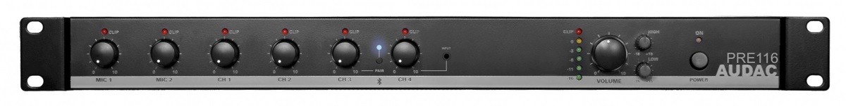 Audac PRE116 – професійний 6-канальний підсилювач для однозонного озвучування у малих та середніх приміщеннях. Призначений для комерційних інсталяцій, таких як ресторани, офіси та конференц-зали. Оснащений гнучкими входами (XLR, RCA, Bluetooth, AUX), виходом Euroblock, 3-смуговим еквалайзером для мікрофонів, 2-смуговим для виходу, фантомним живленням та функцією Talkover. Підтримує пріоритетне приглушення аварійних систем. Компактний 1U рековий корпус, інтуїтивне керування та висока якість звуку.