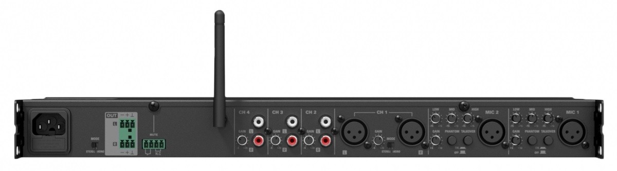 - 6 каналів: 2 мікрофонні (XLR, +48 В), 2 балансні стерео (XLR), 3 небалансні стерео (RCA), 1 AUX (3.5 мм), Bluetooth 4.1.
