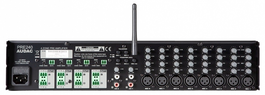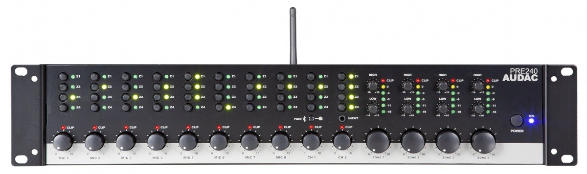 Audac PRE240 – професійний двозонний 10-канальний підсилювач класу D, розроблений для фіксованих інсталяцій у великих комерційних та громадських просторах, таких як офісні центри, торгові майданчики, університети, готелі та конференц-зали. Пристрій забезпечує гнучке управління безліччю аудіоджерел з інтуїтивно зрозумілим інтерфейсом та підтримкою матричної маршрутизації сигналів на дві зони. Оснащений вісьмома мікрофонними входами (XLR) з фантомним живленням 48 В (для каналів 1, 2 і 3-8), функцією Talkover і 3-смуговими еквалайзерами (НЧ/СЧ/ВЧ). Два небалансні стереовходи (RCA) доповнені входом 3.5 мм jack (AUX, мікшується з каналом 2) і вбудованим Bluetooth-модулем (мікшується з каналом 1). Чотири пріоритетні входи Mute (Euroblock) автоматично заглушають інші канали при активації. Два балансові стереовиходи (Euroblock) для зон оснащені 2-смуговими еквалайзерами (НЧ/ВЧ) та 6-сегментною індикацією рівня. Корпус 2U (глибина 335 мм, вага 4,45 кг) підходить для рекового монтажу. PRE240 забезпечує нейтральне та лінійне звучання з мінімальними шумами та спотвореннями.