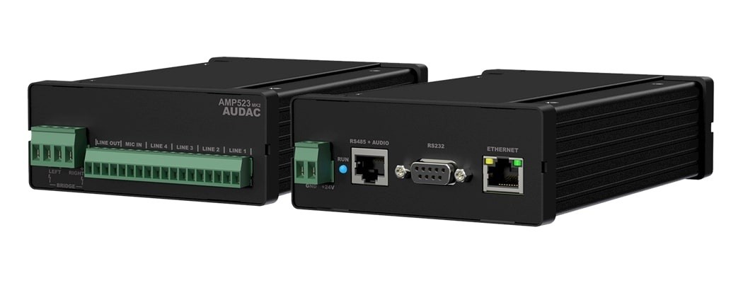 Audac AMP523MK2 – це портативний двоканальний підсилювач потужності класу D другого покоління, розроблений для невеликих комерційних приміщень, таких як конференц-зали, переговорні кімнати, навчальні класи та офіси. Пристрій оснащений вбудованим веб-інтерфейсом для керування, підтримує чотири стереофонічні лінійні входи та один балансний мікрофонний вхід з фантомним живленням (+15 В). Підсилювач забезпечує потужність 2 x 15 Вт (4 Ом), 2 x 7.5 Вт (8 Ом) у стереорежимі або 30 Вт (8 Ом) у мостовому режимі. Компактний металевий корпус дозволяє встановлювати пристрій в обмеженому просторі (шафи, підвісні стелі, під столом) або 19-дюймову стійку з опціональними кронштейнами S-Box. Управління здійснюється через веб-інтерфейс (TCP/IP), програму AUDAC Touch™ (iOS/Android), RS-232, RS-485 або опціональні настінні панелі MWX43/45. Підключення через RJ45 дозволяє інтегрувати настінні мікшери (WLI/WMI) та регулятори гучності. Енергоефективний дизайн з режимом очікування (<3 Вт) відповідає стандартам Energy Star.
