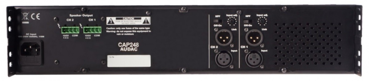 Audac CAP248 – двоканальний професійний підсилювач потужності класу D, розроблений для систем оповіщення та озвучування у комерційних об'єктах, таких як магазини, офіси, ресторани та школи. Забезпечує потужність 2 х 480 Вт (100 В), підтримує двозонний розподіл аудіосигналу. Простота конструкції, надійність та енергоефективність досягаються за рахунок технології класу D та імпульсного джерела живлення. Компактний 2U рековий корпус та малошумне охолодження роблять його зручним для інсталяцій.