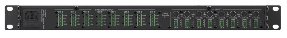 - Восьмизонна конфігурація: 8 каналів по 30 Вт для ліній 70 В, 100 В або 4 Ом, з незалежним керуванням.