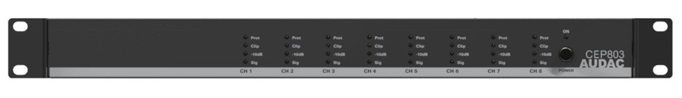 Audac CEP803 – компактний восьмиканальний підсилювач потужності класу D із серії CEP, призначений для систем громадського оповіщення та фонового озвучування у комерційних приміщеннях, таких як торгові центри, офіси, школи, ресторани та конференц-зали. Пристрій забезпечує вихідну потужність 8 x 30 Вт для ліній 70, 100 або низькоомних гучномовців (4 Ом), підтримуючи розподіл звуку по декількох зонах. Підсилювач використовує високоефективну технологію класу D, що відповідає стандарту Energy Star, з функцією Auto Standby, яка автоматично відключає живлення за відсутності вхідного сигналу та миттєво активує пристрій у разі його появи. Входи реалізовані через 3-контактні клемні блоки Phoenix (3.81 мм), а виходи – через 4-контактні блоки Phoenix (5.08 мм). Перемикачі Link на задній панелі дозволяють послідовно з'єднувати входи каналів для передачі загального сигналу. Пасивне (конвекційне) охолодження забезпечує безшумну роботу та мінімальне обслуговування. Корпус 1U (глибина 335 мм, вага 6 кг) виконаний із сталі та призначений для рекового монтажу 19".