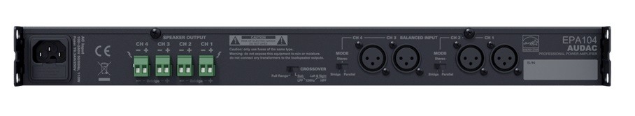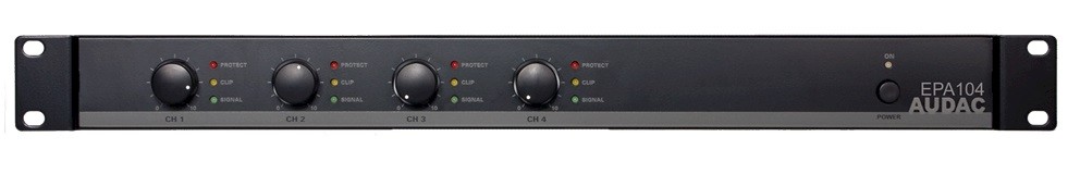 Audac EPA104 – чотириканальний стереопідсилювач потужності класу D, призначений для малих та середніх аудіоінсталяцій, таких як ресторани, магазини та конференц-зали. Забезпечує високу енергоефективність з автоматичним переходом у режим очікування (<1 Вт). Компактний (1U, 4.5 кг) з пасивним охолодженням для безшумної роботи та мінімального обслуговування. Підтримує два незалежні стереопотоки та вбудований активний кросовер, ідеально підходячи для систем із сабвуфером. Оснащений захистом від короткого замикання, перегріву та перевантаження.