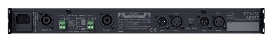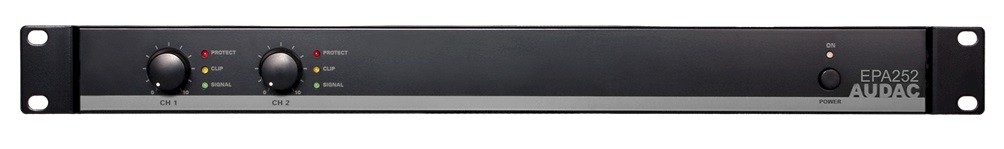 Audac EPA252 – енергоефективний двоканальний стереопідсилювач потужності класу D, призначений для професійних аудіоінсталяцій, таких як конференц-зали, магазини та ресторани. Компактний (1U, 4.4 кг), з пасивним охолодженням для безшумної роботи та мінімального обслуговування. Автоматично переходить у режим очікування (<1 Вт) за відсутності сигналу. Оснащений захистом від короткого замикання, перегріву, перевантаження та лімітером.