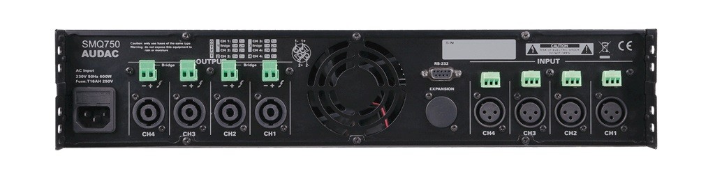 Audac SMQ750 – це чотириканальний інтегральний підсилювач потужності із серії SMQ, що пропонує новий стандарт доступного посилення для стаціонарних та мобільних аудіоустановок. Моделі серії відрізняються вихідною потужністю, але поєднуються загальними характеристиками, включаючи високоефективні модулі класу D та вбудований DSP-процесор для обробки та корекції сигналу. DSP дозволяє виконувати цифрову фільтрацію з регульованими смуговими фільтрами (ФНЧ, ФВЧ, Band Pass, 12-24 дБ/октаву, Лінквіц-Рейлі, Бессель, Баттерворт), 7-смуговий параметричний еквалайзер (Q 0.1-11) затримки (0-12 м). Параметри DSP захищаються паролем адміністратора через USB-ключ, а користувач без ключа може регулювати лише гучність. Конфігурації завантажуються з ПК через USB-порт на передній панелі, а віддалене керування доступне через RS-232. Підсилювач оснащений захистом від перевантаження, короткого замикання та перегріву, а також вентилятором із термоконтролем.