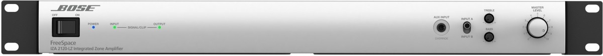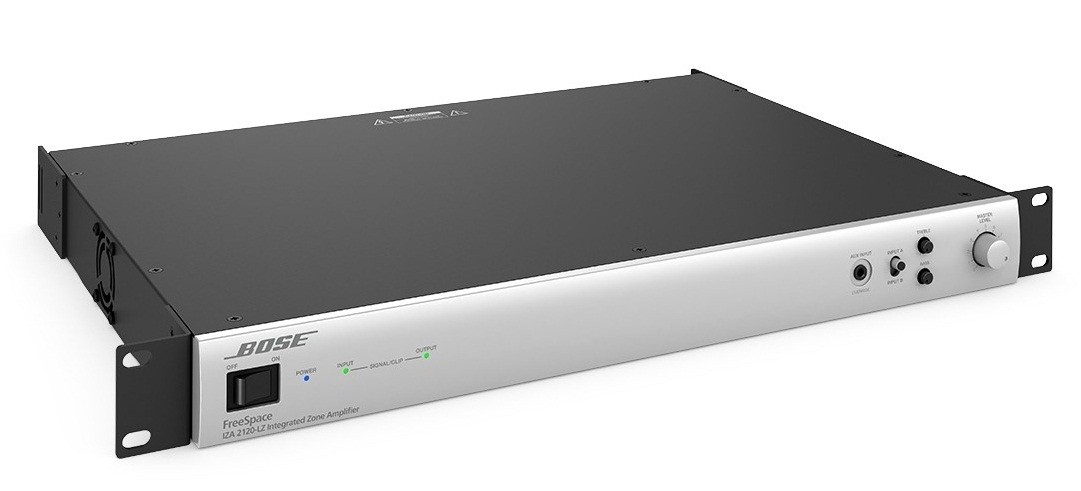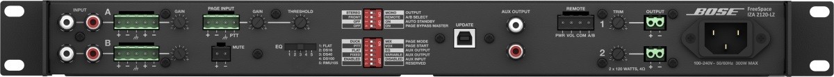 Bose FreeSpace IZA 2120-LZ – це двоканальний зонний мікшер-підсилювач, розроблений для озвучування невеликих приміщень із можливістю поділу на дві зони. Пристрій підтримує низькоомні навантаження (4/8 Ом) та забезпечує потужність 2 x 120 Вт (4 Ом) або 2 x 60 Вт (8 Ом). Підсилювач оснащений вбудованим DSP (24 біт/48 кГц) з попередньо встановленими еквалайзерами для акустичних систем Bose FreeSpace (DS 16, DS 40, DS 100, RoomMatch Utility RMU105), що спрощує налаштування звуку. Входи включають два основних балансних/небалансних лінійних (RCA та 5-pin Euroblock), балансний лінійний вхід для оповіщення (4-pin Euroblock) та небалансний мікрофонний/лінійний вхід (3.5 мм Jack) на передній панелі. Пристрій підтримує керування через зовнішні контролери Bose CC-1 та CC-2, а також має функцію затримки (до 10.4 мс) та енергозберігаючий режим очікування. Система перемикачів на задній панелі дозволяє настроювати маршрутизацію сигналу та режими роботи. Компактний рековий корпус 1U з активним охолодженням (один вентилятор) забезпечує зручність встановлення.