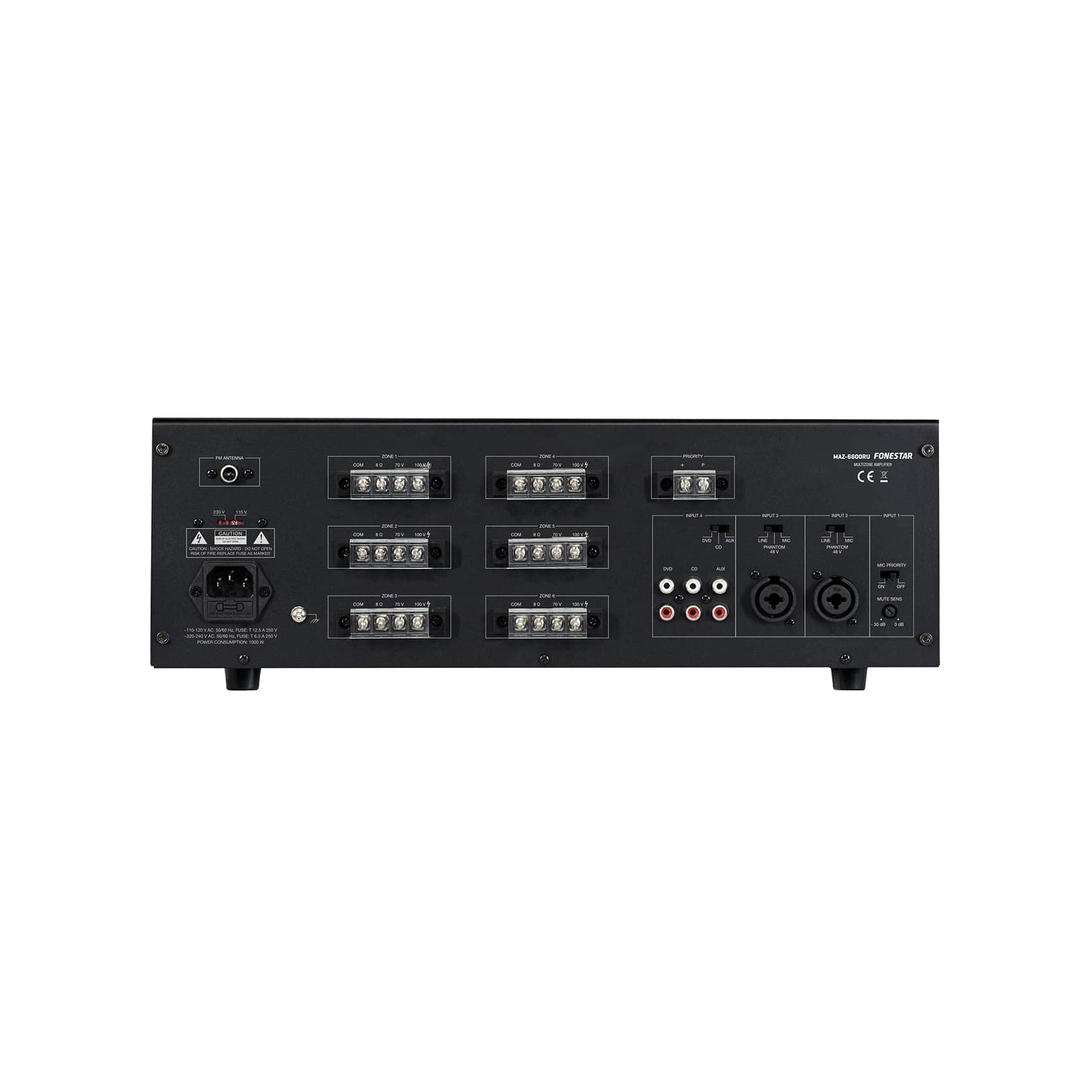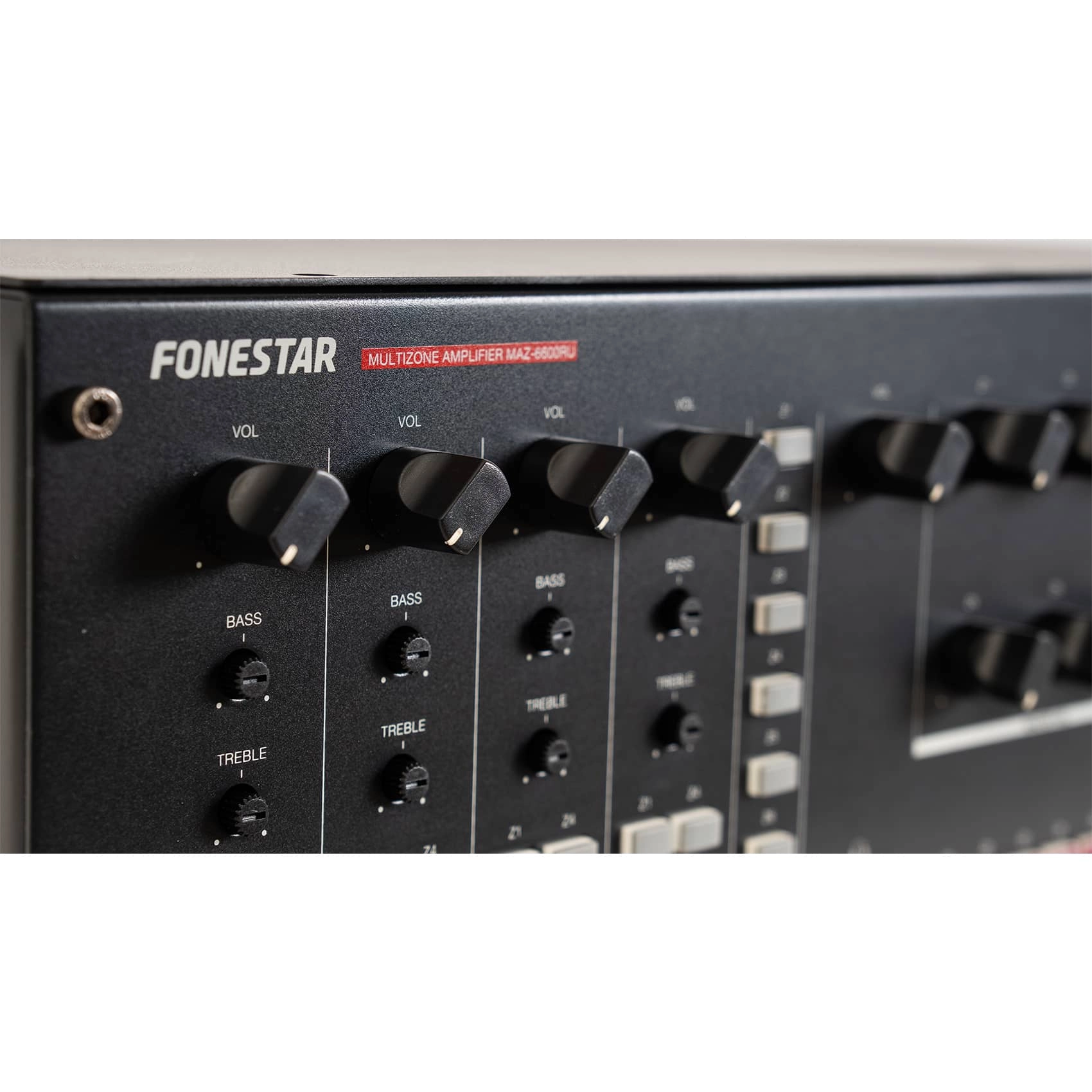 Fonestar MAZ-6600RU – матричний багатоканальний підсилювач класу D, призначений для систем громадського оповіщення та фонового озвучування у комерційних приміщеннях, таких як торгові центри, ресторани, готелі, освітні заклади та спортивні центри. Пристрій забезпечує потужність 6 x 100 Вт RMS для шести зон із незалежним регулюванням гучності та матричною маршрутизацією п'яти вхідних каналів на будь-яку із зон. Підтримує лінії 100 В і низькоомні гучномовці (4-8 Ом). Вбудований плеєр відтворює MP3 через USB/SD (до 32 ГБ) та включає цифровий FM-тюнер з пресетами та автопошуком. Підсилювач оснащений трьома мікрофонними/лінійними входами (1 небалансний, 2 балансних Combo XLR/6.3 мм) з фантомним живленням 48 В, двома AUX-входами (RCA та 3.5 мм jack) та пріоритетними функціями для мікрофона 1 (за рівнем сигналу або замикання). Підтримує музичні тони дзвінка (chime). Euroblock-конектори для гучномовців та лінійний вихід для моніторингу забезпечують гнучкість підключення. Корпус 2U (глибина 345 мм, вага 10.2 кг) підходить для рекового монтажу.