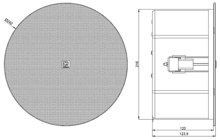 Система оснащена коаксіальними динаміками: 6.5-дюймовим конусним вуфером і 1-дюймовим твітером з м'яким куполом, що забезпечують частотний діапазон 90 Гц – 20 кГц (±3 дБ) і 65 Гц – 20 кГц (-10 дБ). Чутливість складає 86 дБ, максимальний звуковий тиск сягає 106 дБ, а конічна дисперсія 145° забезпечує широку зону покриття, що є ідеальним для приміщень з високими стелями. Модель підтримує роботу в низькоомному режимі (8 Ом) з номінальною потужністю 60 Вт (пікова – 120 Вт) і в трансляційній мережі 100 В з відведенням потужності 60, 30 або 15 Вт, що вибирається через ротаційний перемикач.