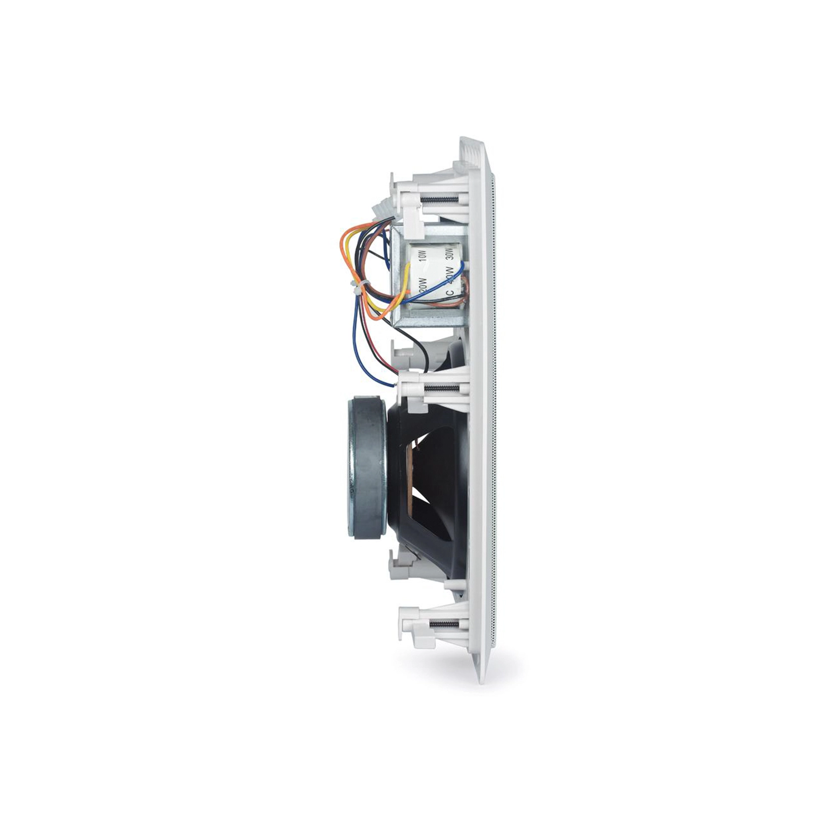 Корпус виконаний із міцного матеріалу, а прямокутна решітка сіро-білого кольору (RAL 9003, 7047) забезпечує естетичний зовнішній вигляд та захист динаміків. Компактна конструкція з глибиною 100 мм полегшує встановлення в стелю.