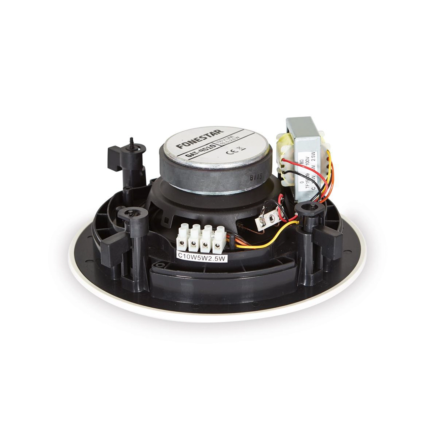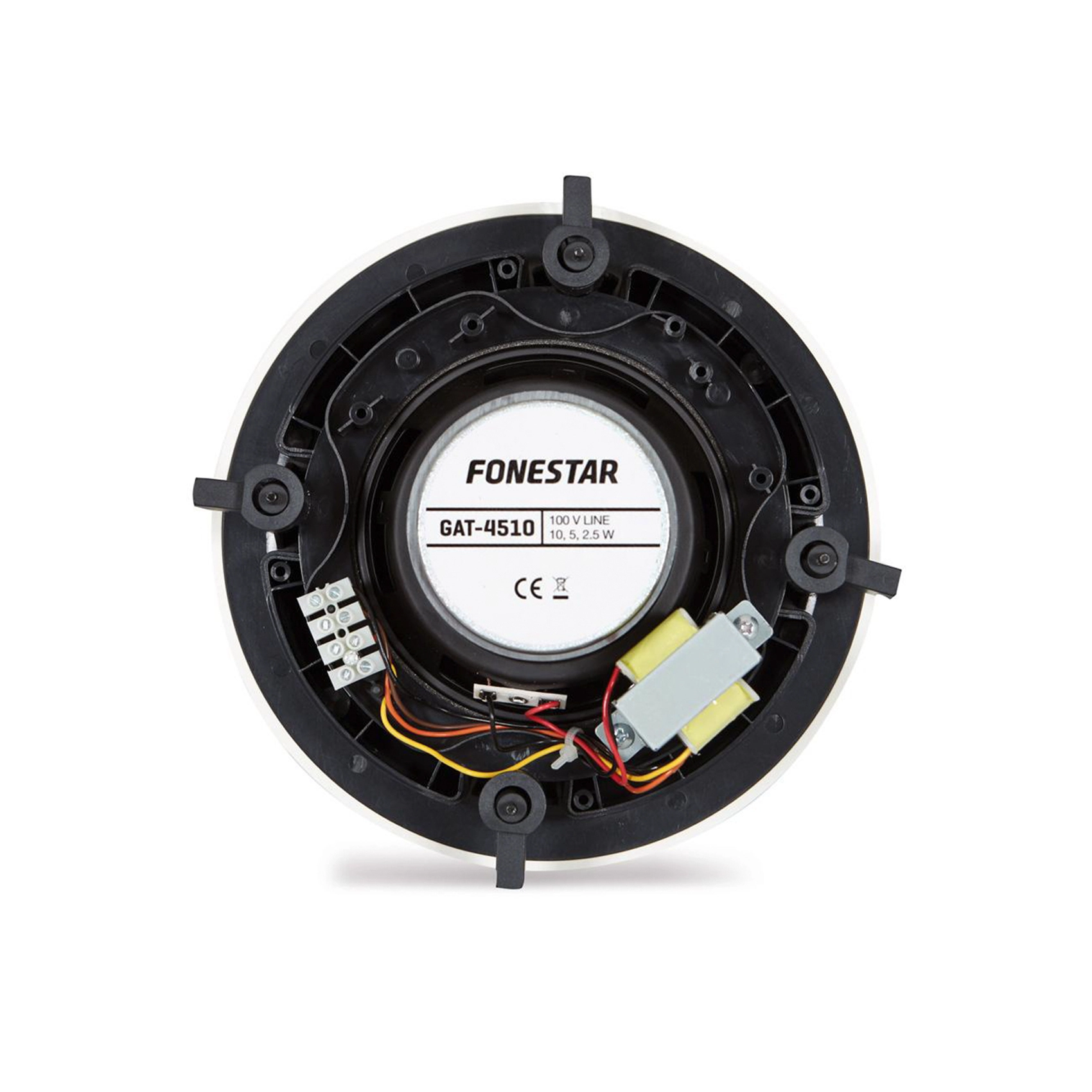 Fonestar GAT-4510 – це пасивна двосмугова стельова трансформаторна акустична система із серії GAT, призначена для звукового оформлення приміщень, таких як офіси, ресторани, магазини та інші громадські простори. Модель поєднує якісне звучання, елегантний безрамковий дизайн та простоту встановлення, що робить її ідеальною для фонової музики та голосових оголошень.