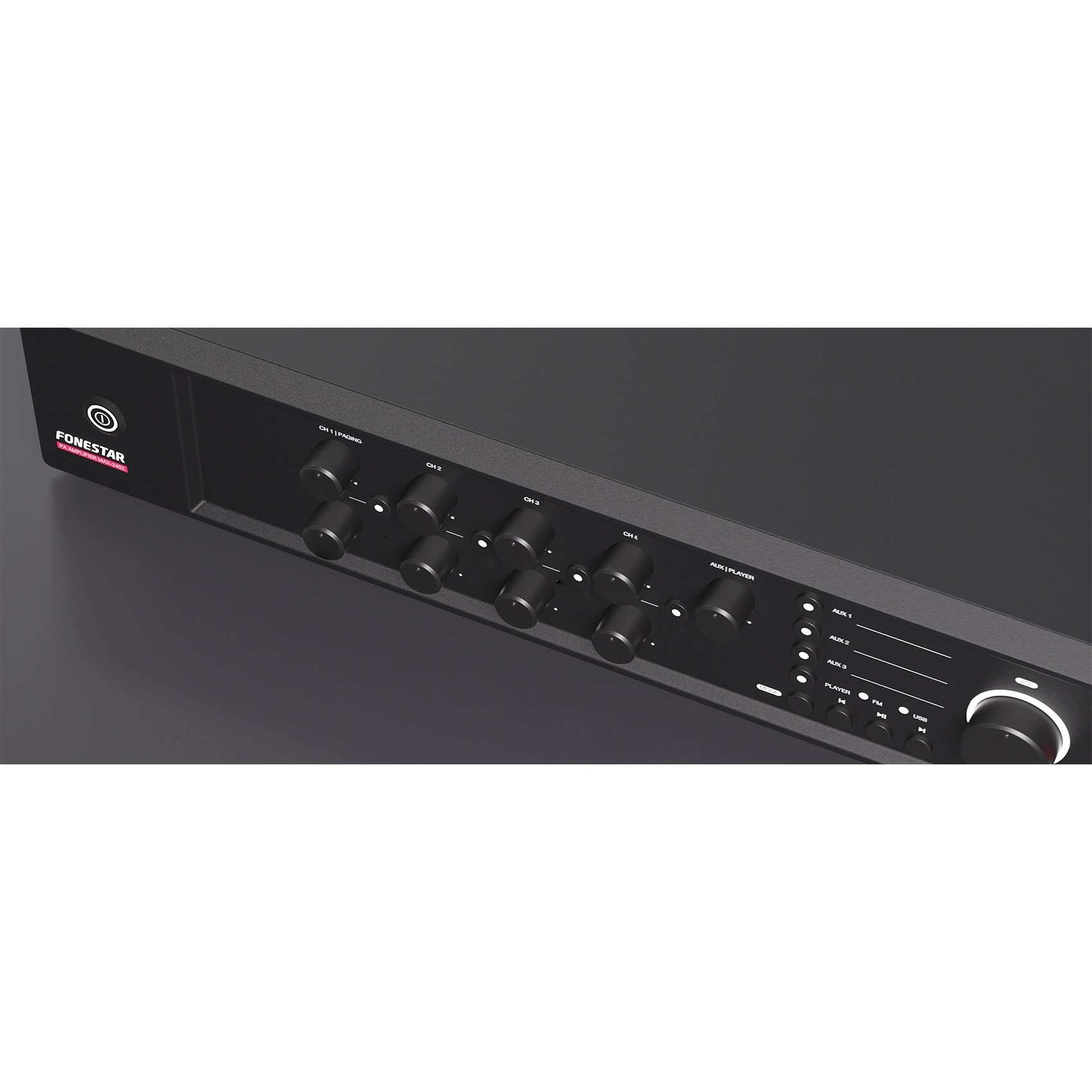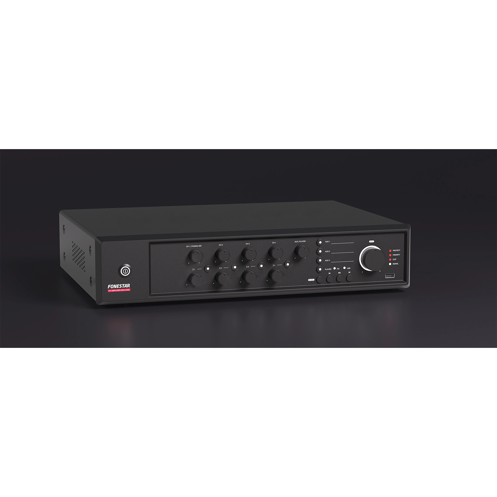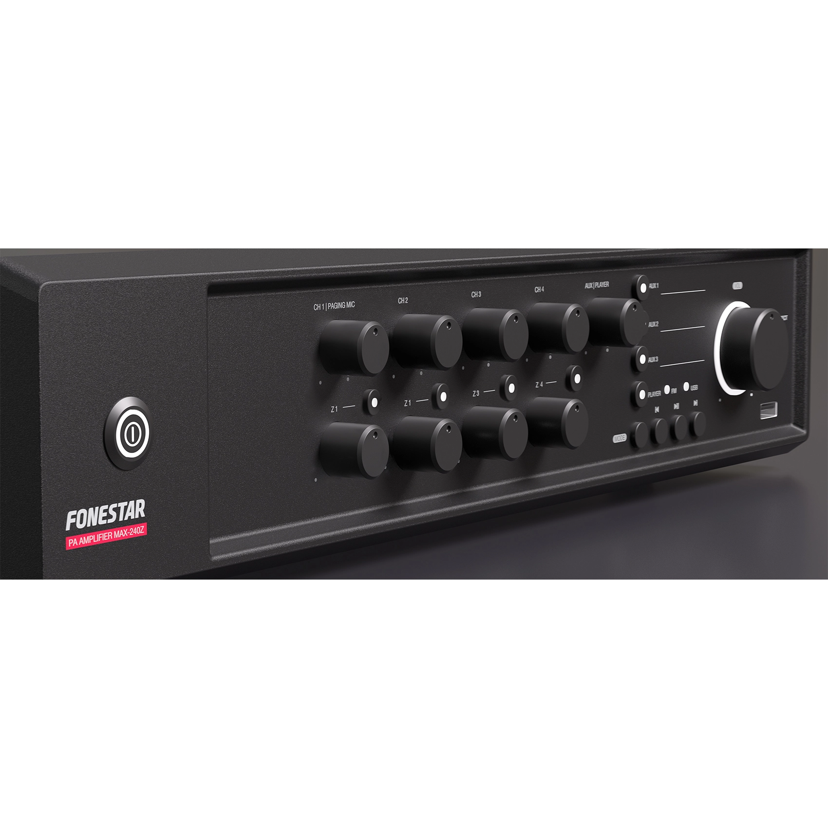 Fonestar MAX-240Z – монопідсилювач класу D з функцією мікшування, призначений для систем громадського оповіщення та фонового озвучування у комерційних приміщеннях, таких як магазини, ресторани, освітні заклади, бари та виставкові простори. Пристрій оснащений сучасною технологією класу D та імпульсним джерелом живлення (SMPS), що забезпечує високу енергоефективність та надійність. Підсилювач підтримує виходи для ліній 100, 70 і низькоомних гучномовців (4 Ом) із загальною потужністю 240 Вт RMS, що розподіляється між чотирма зонами з індивідуальним регулюванням гучності і можливістю відключення. Вбудований медіаплеєр підтримує USB/FM та відтворення MP3/WAV з функцією автозапуску під час увімкнення. Підсилювач має мікрофонні входи з пріоритетом (VOX), генератором тонів виклику (chime) та підтримкою фантомного живлення 48 В. Euroblock-конектори забезпечують надійне та довговічне підключення з мінімальним обслуговуванням. Корпус 2U (глибина 360 мм) підходить для настільного чи рекового монтажу.