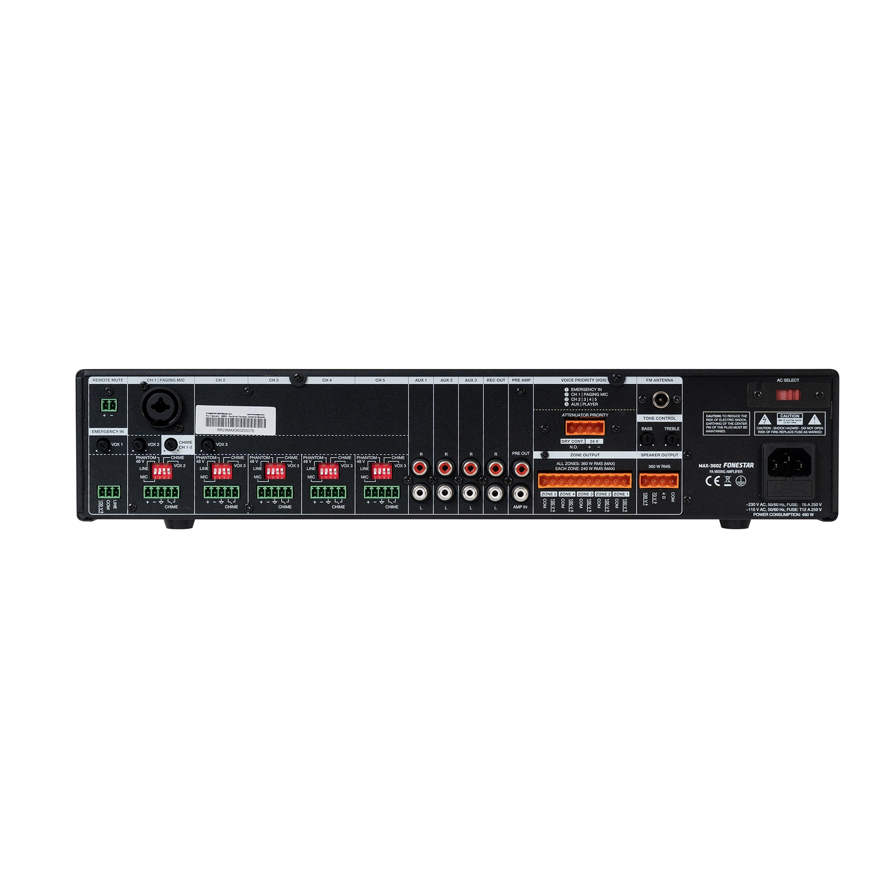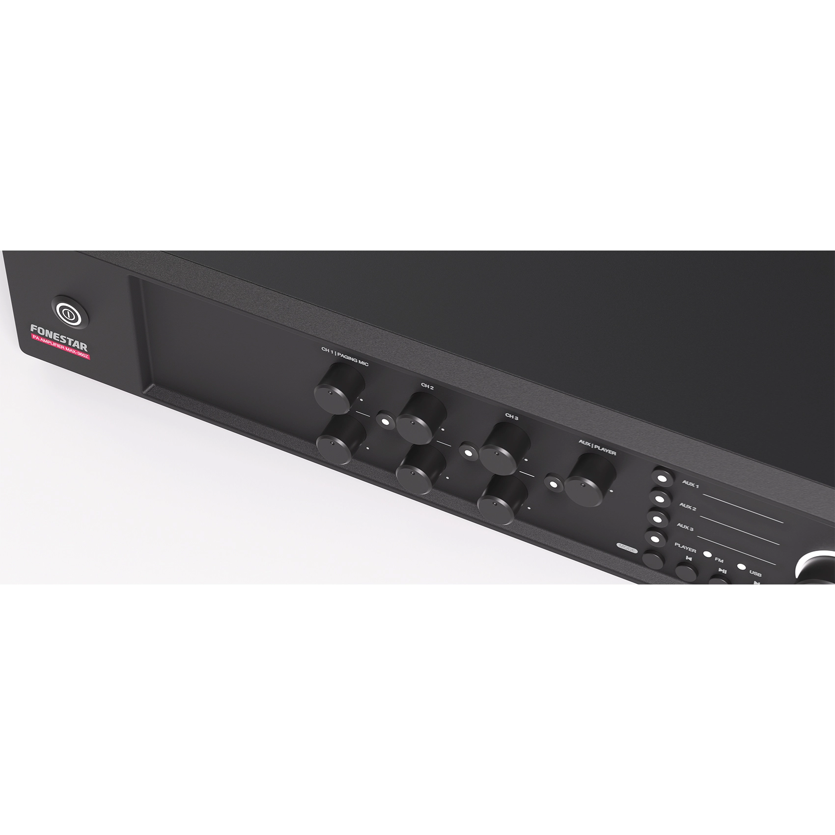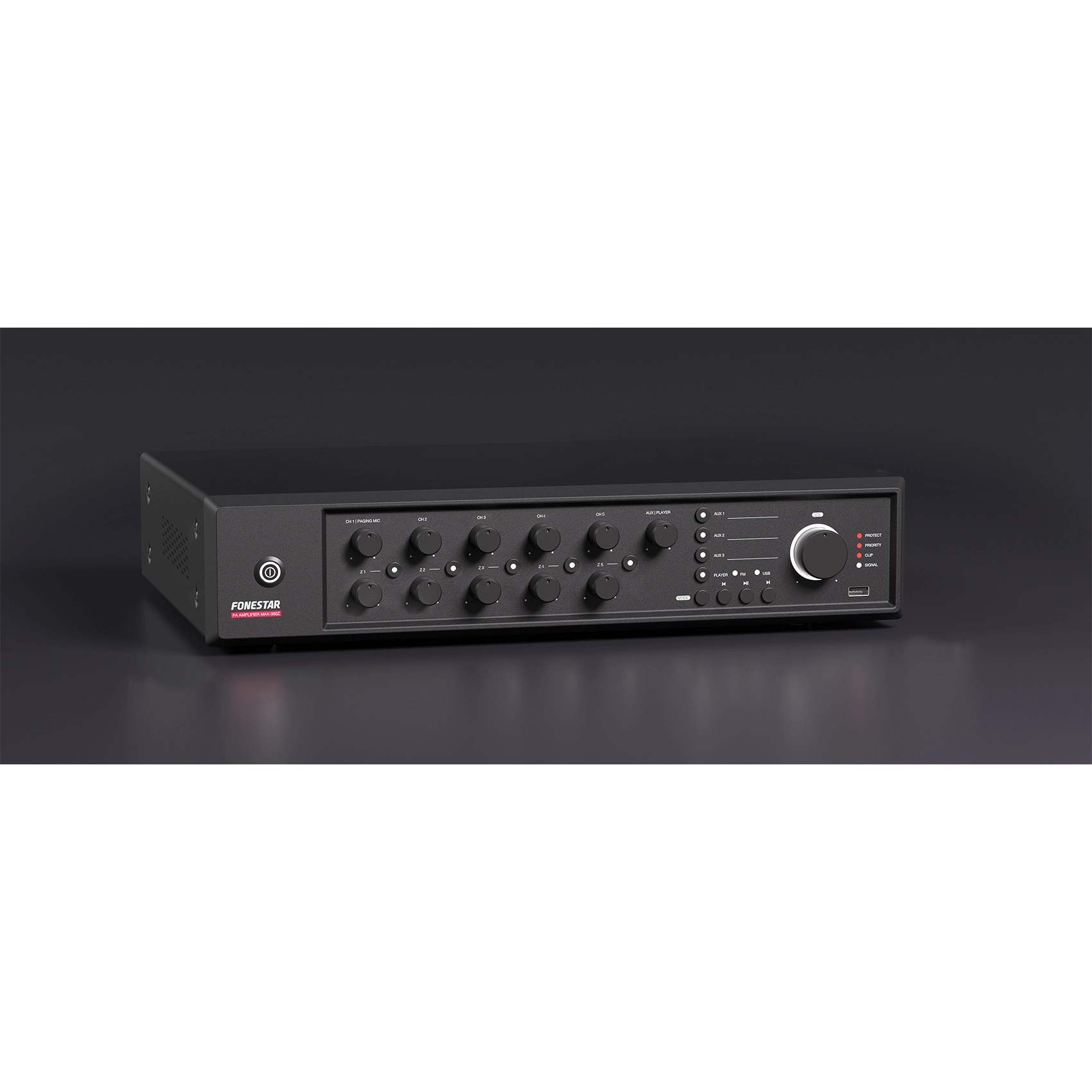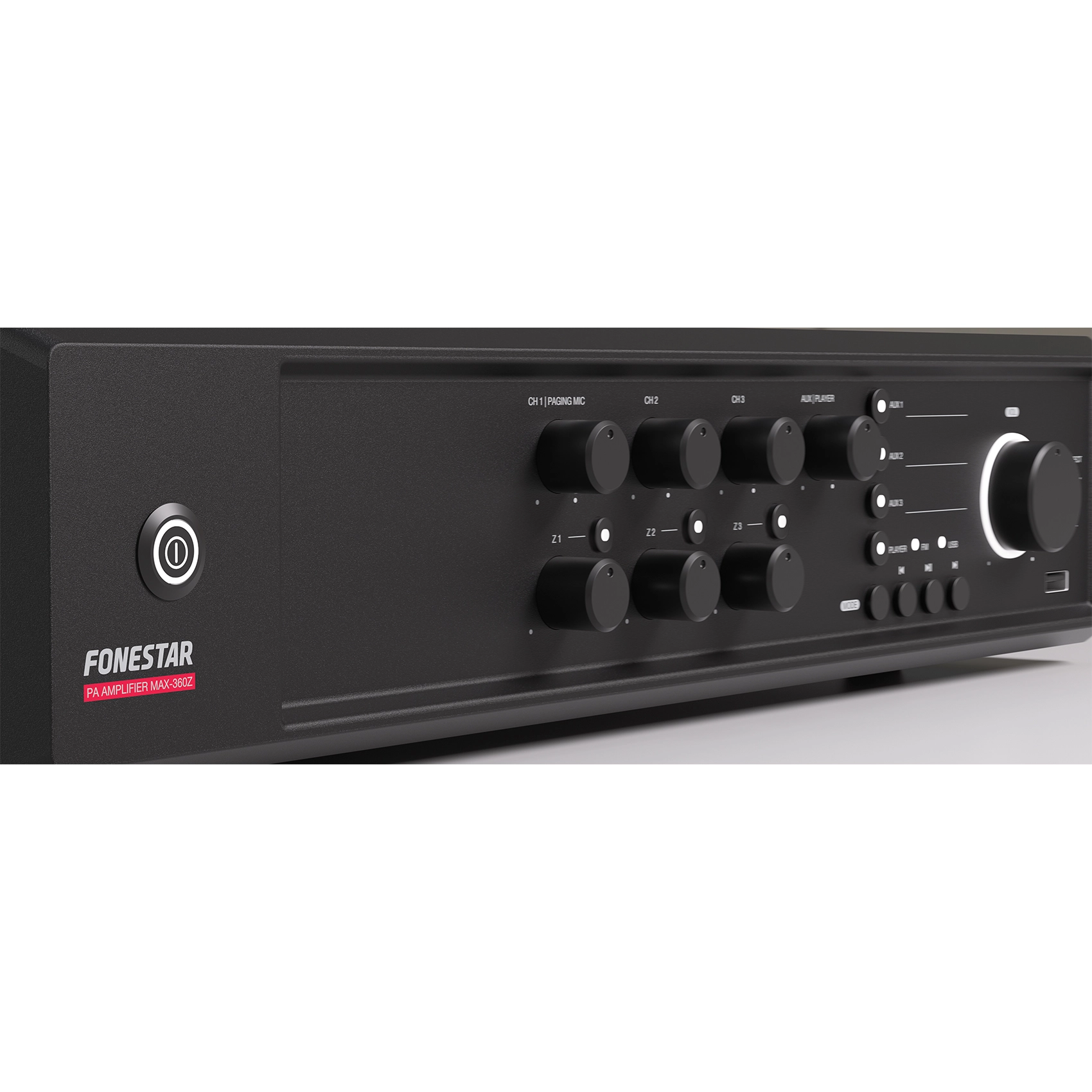 Fonestar MAX-360Z – монопідсилювач класу D з функцією мікшування, призначений для систем громадського оповіщення та фонового озвучування у комерційних приміщеннях, таких як магазини, ресторани, освітні заклади, бари та виставкові простори. Пристрій використовує технологію класу D та імпульсне джерело живлення (SMPS) для високої енергоефективності та надійності. Підсилювач забезпечує потужність 360 Вт RMS, що розподіляється між п'ятьма зонами з індивідуальним регулюванням гучності (7 позицій або вимк.) і підтримує лінії 100 В, 70 В та низькоомні гучномовці (4 Ом). Вбудований медіаплеєр відтворює MP3/WAV через USB (до 64 ГБ) та FM-радіо з функцією автозапуску. Підсилювач має мікрофонні входи з пріоритетом VOX, фантомним живленням 48 В та генератором тонів виклику (chime). Підтримуються входи для аварійного сигналу (100) і м'ють (24). Euroblock-конектори забезпечують надійне підключення із мінімальним обслуговуванням. Корпус 2U (глибина 360 мм) підходить для настільного чи рекового монтажу.