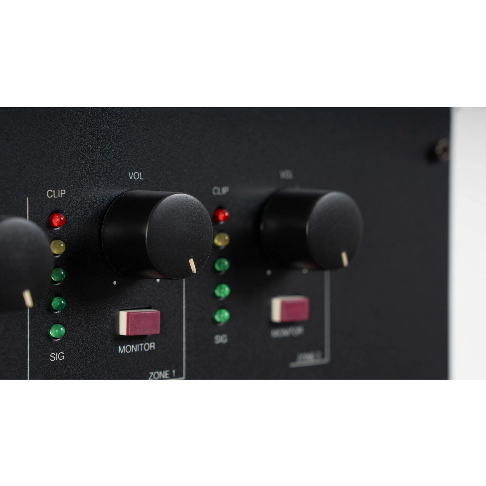 - Передня панель: Регулятори гейну, НЧ/ВЧ (±10 дБ @ 100 Гц і 10 кГц), гучності, вибір зон для кожного входу; гучність для зон та монітора