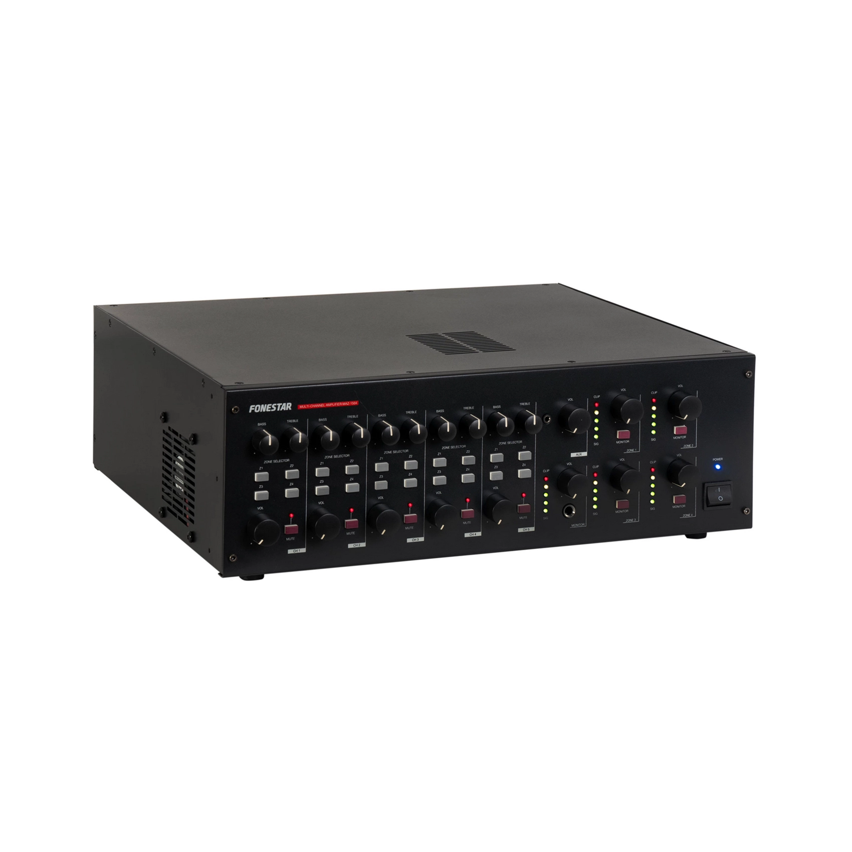 Fonestar MAZ-1504 – матричний багатоканальний підсилювач класу D, розроблений для систем громадського оповіщення та фонового озвучування у комерційних приміщеннях, таких як готелі, ресторани, торгові центри, спа-салони, офіси та спортивні центри. Пристрій забезпечує потужність 4 x 150 Вт RMS для чотирьох зон з незалежним регулюванням гучності та матричною маршрутизацією п'яти вхідних каналів на будь-яку із зон. Підтримує лінії 100, 70, 25 і низькоомні гучномовці (4 і 8 Ом). Підсилювач оснащений фантомним живленням 48 В, пріоритетними функціями для телефонного пейджингу та входу 1 (за рівнем сигналу або замикання контактів), а також музичними тонами дзвінка (chime). Входи включають 3 балансових мікрофонних/лінійних (Combo XLR/6.3 мм), 2 AUX (RCA) та 1 телефонний пейджинг (Euroblock). Виходи представлені клемними блоками для зон, лінійними виходами (Euroblock) та виходом для моніторингу (Euroblock). Корпус 2U (глибина 410 мм, вага 15 кг) підходить для рекового монтажу. Пристрій забезпечує високу надійність завдяки захисту від температури, перевантаження та короткого замикання.