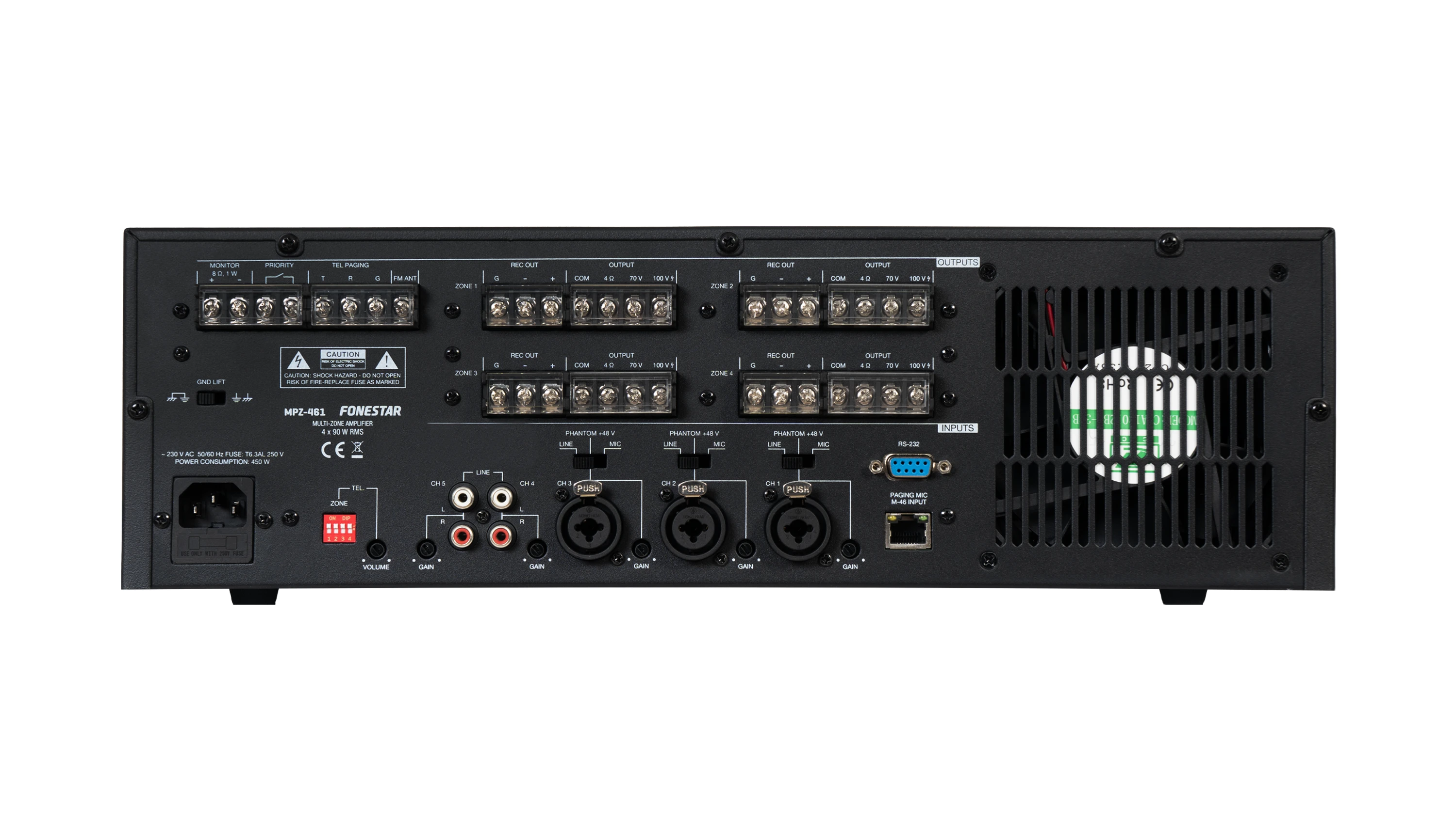 Fonestar MPZ-461 – матричний багатозонний підсилювач класу D, розроблений для систем громадського оповіщення та фонового озвучування у комерційних приміщеннях, таких як магазини, ресторани, школи, офіси та торгові центри. Пристрій забезпечує потужність 4 x 90 Вт RMS (4 x 60 Вт RMS за іншими джерелами) для чотирьох зон із незалежним регулюванням гучності та матричною маршрутизацією п'яти вхідних каналів. Підтримує лінії 100 В і низькоомні гучномовці (4-16 Ом). Вбудований плеєр відтворює MP3 через USB/SD (до 32 ГБ), має FM-тюнер та Bluetooth. Підсилювач оснащений трьома балансними мікрофонними/лінійними входами (Combo XLR/6.3 мм), одним входом для мікрофона із селектором зон (M-46, RJ45), двома AUX-входами (RCA) та входом для телефонного пейджингу (Euroblock). Підтримує фантомне живлення 12 В, пріоритетні оголошення та тоновий сигнал chime. Euroblock-конектори забезпечують надійне підключення. Корпус 2U (глибина 330 мм, вага 8.5 кг) підходить для рекового монтажу.