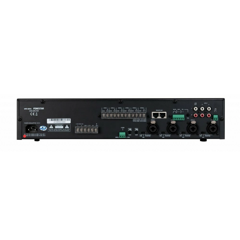 Fonestar MPZ-6241 – монопідсилювач класу D з функцією мікшування, призначений для систем громадського оповіщення та фонового озвучування у комерційних приміщеннях, таких як магазини, ресторани, бари, освітні заклади та виставкові простори. Пристрій оснащений високоефективною технологією класу D і забезпечує потужність 240 Вт RMS, що розподіляється між шістьма зонами з незалежним регулюванням гучності (максимум 50 Вт RMS на зону). Підтримує лінії 100 В, 70 В і низькоомні гучномовці (4-16 Ом). Вбудований плеєр відтворює MP3 через USB/SD та FM-радіо, з Bluetooth для потокової передачі. Підсилювач має 6 вхідних каналів з індивідуальними регуляторами гучності, НЧ/ВЧ та гейна, а також фантомне живлення 48 для мікрофонів. Підтримує підключення до 6 мікрофонів із селектором зон (M-62, RJ45) для оголошень. Входи для телефону (TEL) та аварійного сигналу (EMC) забезпечують пріоритетне мовлення. Euroblock та RCA-конектори спрощують підключення. Корпус 2U (глибина 353 мм, вага 8.2 кг) підходить для рекового монтажу.
