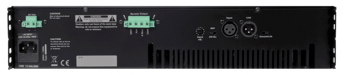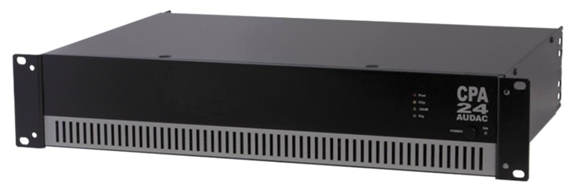 Audac CPA24 – це одноканальний трансляційний підсилювач потужності класу A/B, призначений для систем музичної трансляції та оповіщення у невеликих та середніх приміщеннях. Забезпечує вихідну потужність 240 Вт з підтримкою низькоомних ліній (4 Ом) та трансляційних ліній (70/100 В). Пристрій відрізняється простотою управління, оснащений балансним входом XLR, виходом, що лінкує XLR, клемною колодкою для гучномовців, регулятором рівня вхідного сигналу, перемикачем високопрохідного фільтра (HPF) і індикаторами стану. Живлення здійснюється від мережі AC (230-240 В або 110-115 В, з перемикачем) або від DC 24 В в аварійних ситуаціях. Для захисту передбачено плавкий запобіжник, захист від короткого замикання, перегріву та перевантаження, а також сигнальний лімітер. Ефективне охолодження забезпечується малошумним двошвидкісним вентилятором. Металевий рековий корпус висотою 2U дозволяє монтувати підсилювач у стійку або апаратну шафу з опціональним кріпленням CPE100.