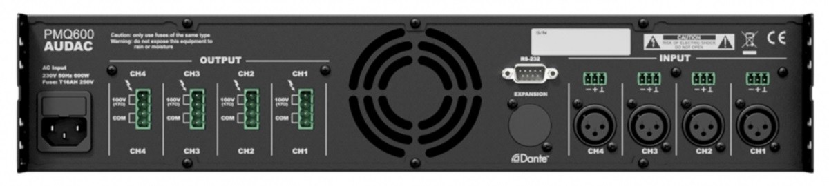 - Гнучкість підключення: Входи XLRf та 3-pin Euroblock, виходи 4-pin Euroblock для 100 В ліній, RS-232 для віддаленого керування, опціональний Dante™ інтерфейс (Audac ANI44) для передачі сигналу Ethernet.