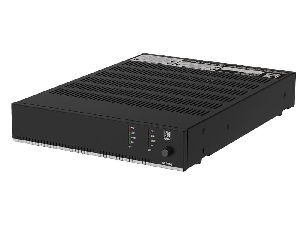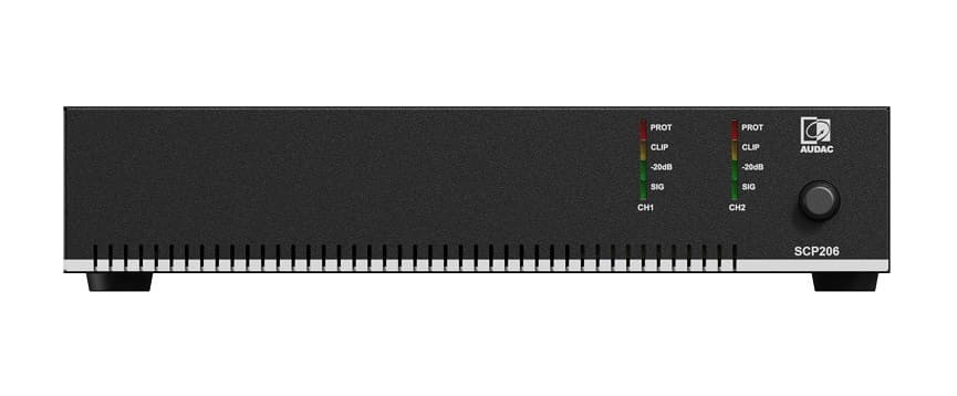 Audac SCP206 – це двоканальний підсилювач потужності із серії SCP, призначений для комерційних інсталяцій. Компактний напіврековий (половинний 19-дюймовий) корпус дозволяє використовувати його в стереофонічному низькоомному режимі (4/8 Ом) або в мостовому режимі для ліній 70/100 В. Підсилювач забезпечує потужність 2 x 60 Вт (4 Ом), 2 x 30 Вт (8 Ом). Серія SCP включає п'ять моделей з потужністю від 120 до 1000 Вт, що робить універсальною для різних завдань. Пристрій має пасивне охолодження, енергоефективний режим очікування (Energy Star®), а також роз'єм RJ45 для підключення настінних панелей WP2xx або контролерів гучності. Монтаж можливий до 10.5-дюймової стійки, 19-дюймової стійки (два пристрої поруч) або на столі з використанням адаптерів MBS310.