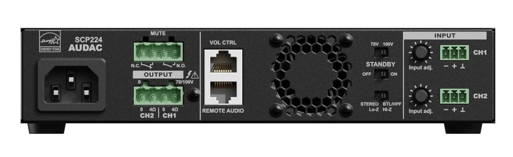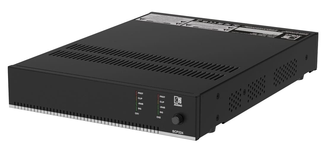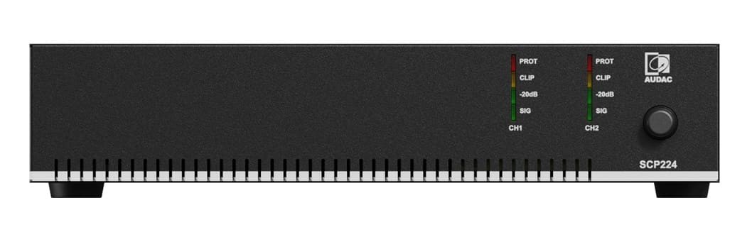 Audac SCP224 – це двоканальний підсилювач потужності із серії SCP, призначений для комерційних інсталяцій. Пристрій у напіврічковому (половинний 19-дюймовий) корпусі підтримує стереофонічний низькоомний режим (4/8 Ом) та мостовий режим для ліній 70/100 В. З потужністю 2 x 240 Вт (4 Ом), 2 x 120 Вт (8 Ом) або 48 входить до серії з трьох моделей з потужністю від 240 до 600 Вт. Підсилювач оснащений активним охолодженням, енергозберігаючим режимом очікування (сертифікація Energy Star®) та роз'ємом RJ45 для підключення настінних панелей WP2xx або контролерів гучності, забезпечуючи plug & play інтеграцію. Монтаж можливий до 10.5-дюймової стійки, 19-дюймової стійки (два пристрої поруч) або на столі з використанням адаптерів MBS310.