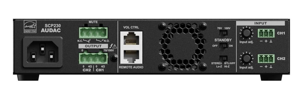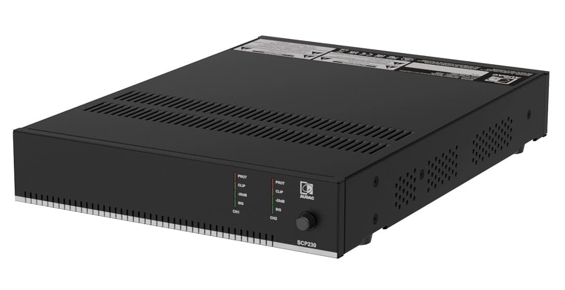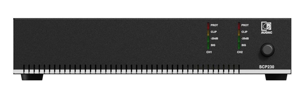 Audac SCP230 – це двоканальний підсилювач потужності із серії SCP, розроблений для комерційних інсталяцій. Пристрій у напіврічковому (половинний 19-дюймовий) корпусі підтримує стереофонічний низькоомний режим (4/8 Ом) та мостовий режим для ліній 70/100 В. З потужністю 2 x 300 Вт (4 Ом), 2 x 150 Вт (8 Ом) або 300 входить до серії з трьох моделей з потужністю від 240 до 600 Вт. Підсилювач оснащений активним охолодженням, енергозберігаючим режимом очікування (сертифікація Energy Star®) та роз'ємом RJ45 для підключення настінних панелей WP2xx або контролерів гучності, забезпечуючи plug & play інтеграцію. Монтаж можливий до 10.5-дюймової стійки, 19-дюймової стійки (два пристрої поруч) або на столі з використанням адаптерів MBS310.