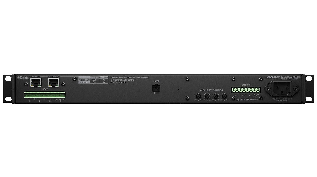 Bose PowerShare PS404D – адаптивний підсилювач потужністю 400 Вт для фіксованих інсталяцій, що забезпечує гнучке розподілення потужності між усіма каналами завдяки запатентованій технології. Підходить для релігійних установ, конференц-центрів, магазинів, ресторанів, барів та інших об'єктів, підтримуючи низькоомне (4-8 Ом) та високоомне (70/100 В) підключення. Не вимагає зовнішнього сигнального процесора завдяки вбудованій системі обробки сигналу та прямому доступу до зональних контролерів.