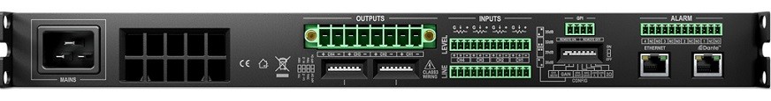 - Підключення: Вбудована підтримка Dante (4 цифрові входи), 4 аналогові входи лінійного рівня, GPIO для віддаленого керування та сигналізації.