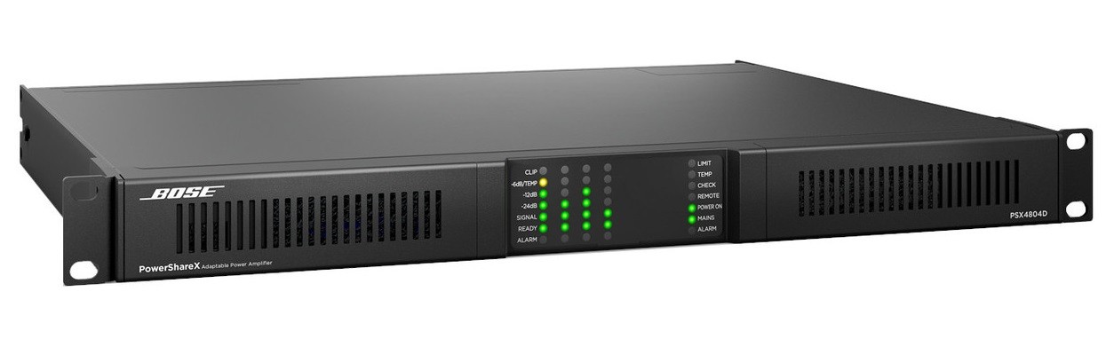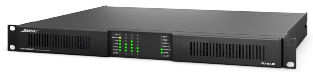 Bose PowerShareX PSX4804D – 4-канальний підсилювач потужністю 4800 Вт, оптимізований для систем Bose Professional, зі спрощеною установкою завдяки вбудованому DSP та інтеграції з ControlSpace Designer. Підходить для створення компактних аудіосистем з меншою кількістю обладнання, ідеальним для конференц-центрів, релігійних установ, магазинів та ресторанів.
