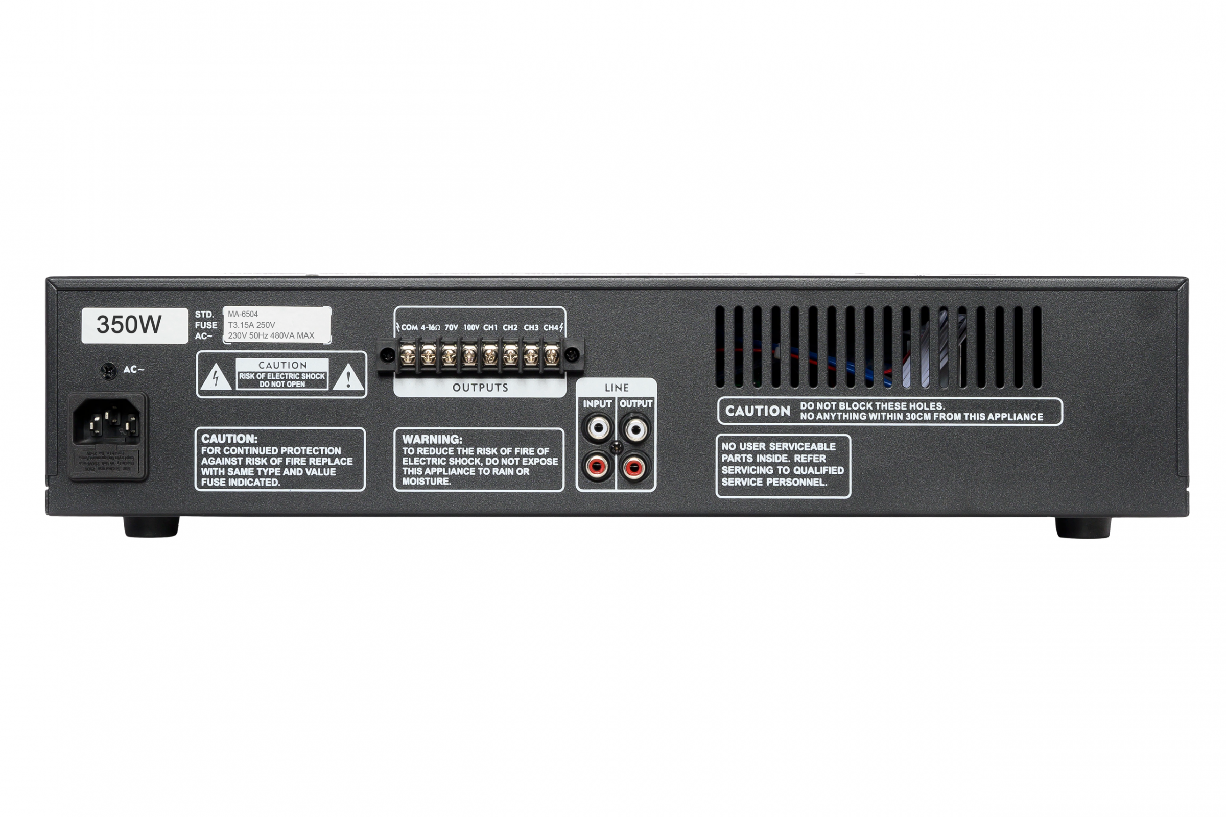 350Підсилювачі потужності серії MA є ідеальним поєднанням якості та доступності у сфері озвучування систем трансляції фонового та мовного оповіщення. Передня панель та ручки підсилювача виконані з алюмінієвого сплаву, великий LCD екран, хромовані кнопки, ергономічний дизайн надають пристрою дуже делікатний та інтуїтивно зрозумілий зовнішній вигляд. Завдяки запатентованій технології захисту лінії трансляції звуку підсилювачі серії MA підходять для роботи в мережах далекого радіомовлення з використанням трансляційних акустичним систем різної потужності.